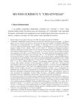ISSN 1851-2844 MUNDO JURÍDICO Y “CREATIVIDAD” Miguel Ángel CIURO CALDANI * I. Ideas fundamentales 1. La palabra creatividad, hondamente vinculada con “creación” y “crear”, tiene relevante multivocidad. En nuestro caso, nos referiremos a la “creatividad” como capacidad de ingenio, relacionada con la imaginación como facilidad para formar ideas, proyectos, etc., nuevos, y opuesta a la rutina; de cierto modo, como capacidad de creación. * Profesor titular de la Facultad de Derecho de la UNR. Investigador principal del CONICET. “Creatividad”: capacidad de creación; Creación: Acto de crear o sacar Dios una cosa de la nada./ ... 5. Obra de ingenio, de arte o artesanía muy laboriosa, o que revela una gran inventiva (REAL ACADEMIA ESPAÑOLA, “Diccionario de la Lengua Española”, 21ª. ed., Madrid, t. I, 1992, págs. 592 /3). La relación de la creatividad con el arte explica que desde tiempos remotos se vincule a la Jurisprudencia con el arte (Arte de lo bueno y equitativo, Ulpiano y Celso, “Digesto”, Parte I, Libro I, Título I, 1, “El Digesto del Emperador Justiniano” traducido y publicado en el siglo anterior por el Licenciado don Bartolomè Agustín Rodríguez de Fonseca, Nueva Edición, Madrid, Ramón Vicente, t. I, 1872, pág. 31). No sin cierta razón se ha presentado al Derecho como ingeniería social (cabe c. por ej. POUND, Roscoe, “Las grandes tendencias del pensamiento jurídico”, trad. José Puig Brutau, Barcelona, Ariel, 1950, págs. 200 y ss.; “An Introduction to the Philosophy of Law”, ed. revisada, New Haven - Londres, Yale University Press, por ej. pág. 47; puede v. questia, POUND, Roscoe, “An Introduction to the Philosophy of Law, http://www.questia.com/PM.qst?a=o&d=8598714 (28-11-2006); Social Control Through Law, introducción de A. Javier Trevino, New Brunswick (NJ) y Londres, Transaction, 1997 –1ª. ed. 1942–; GARCIA RUIZ, Leopoldo, “El pensamiento jurídico de Roscoe Pound”, Granada, Comares, 2002; también comentario de Juan Cianciardo en “Dikaion”, 13, 2004; cabe c. The Pound Civil Justice Institute, http://www.roscoepound.org/ (28-11-2006). Es posible v., en relación con el tema, BERGSON, Henri, “L’évolution créatrice”, París, Alcan, 1913; SPENCER, Herbert, “Creación y evolución”, trad. A. Gómez Pinilla, Valencia, Sempere. En cuanto a la creatividad profesional, es posible v. por ej. monografías.com, Indicadores para la educación y el desarrollo de la creatividad profesional, Dr. Alexander Luis Ortiz Ocaña, http://www.monografias.com/trabajos13/indicrea/indicrea.shtml (26-11-2006); como indicadores creativos el autor mencionado cita: originalidad, iniciativa, fluidez, divergencia, flexibilidad, sensibilidad, elaboración, autoestima, motivación, independencia, pensar técnico, innovación, invención y racionalización. En el horizonte teológico de la Creación, puede v. Pequeña Enciclopedia, Creación del Universo, http://www. corazones.org/diccionario/creacion.htm (4-12-2006); La Creación min´adam (“de la nada”) en la teología del encuentro entre las tres revelaciones del Libro, Foro de encuentro, Universidad Averroes de Córdoba, http:// www.webislam.com/numeros/2000/00_5/Articulos%2000_5/Creacion.htm (4-12-2006). En el marco de la publicidad es posible c. v. gr. Derecho.com, Contrato de creación publicitaria, https://libros.derecho.com/151_ 122_461_1_1/Contrato_de_creacion_publicitaria.htm (4-12-2006). Aunque la terminología no es exclusiva, quizás no sea sin razón que en los ámbitos culturales supremos en distintos períodos se haga referencia a la “creación”, en el campo religioso y en el marco capitalista. Imaginación es “Facultad del alma que representa las imágenes de las cosas reales o ideales. / 2. Aprensión falsa o juicio de una cosa que no hay en realidad o no tiene fundamento. / 3. Imagen formada por la fantasía. / 69 www.centrodefilosofia.org.ar / Investigación y Docencia Nº 39 Miguel Ángel Ciuro Caldani ISSN 1851-2844 La noción de creatividad es una construcción, y sus realizaciones se deciden en relaciones con situaciones tomadas como referencia, que también son construcciones. Sin embargo, se trata de construcciones que nos resultan altamente esclarecedoras. Es cierto que el Derecho ha de referirse a la “realidad”, pero también lo es que para la mejor edificación de la realidad suele ser de gran valor la creatividad. Las teorías jurídicas y las culturas son marcos de creatividad. Así, por ejemplo, la escuela de la exégesis centra la creatividad en el legislador y la restringe al máximo posible en el juez. La teoría pura del Derecho se abre a la creatividad en muy diversos despliegues, de interpretación y elaboración de normas. Incluso atiende de manera específica a “los modos de creación del derecho” con miras a “denunciar” la función ideológica del dualismo del Derecho Público y el Derecho Privado. Sin embargo no tematiza el desarrollo de la creatividad como un problema en que pueda aportar, de modo significativo, el pensamiento jurídico. Tal vez quepa sostener que la misma teoría pura es de cierto modo una ficción resultado de una fuerte creatividad, pero la creatividad no tiene ingreso relevante dentro de ella. La escuela del Derecho libre se refiere de manera muy destacada a la creación judicial. 4. Facilidad para formar ideas, proyectos, etc., nuevos...” (REAL ACADEMIA, op. cit., t. II, pág. 1142). Cabe c. por ej. GARCIA-GALIANO, Javier, “Magia catróptica. Biografías. Las vidas imaginarias pueden resultar más precisas y certeras que aquellas recreaciones fundadas en datos y acontecimientos que incluso el protagonista ha olvidado”, en “Milenio”, Cultura, 8 de Noviembre de 2006, pág. 50. Es posible v. GUIBOURG, Ricardo A., “La construcción del pensamiento”, Bs. As., Colihue, 2004. “Rutina” (“routine”), marcha por un camino conocido (COROMINAS, Joan, con la colaboración de José