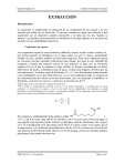 Química Orgánica II Instituto Tecnológico de Celaya EXTRACCIÓN Introducción La extracción es simplemente la separación de un componente de una mezcla o de una solución por medio de un disolvente. El proceso consiste en agitar una solución o una suspensión con un disolvente orgánico inmiscible y en dejar que los dos líquidos se separen. Los distintos solutos presentes se distribuyen en la capa orgánica o en la acuosa de acuerdo con sus solubilidades respectivas. - Coeficientes de reparto Los compuestos orgánicos como alcoholes, aldehídos, cetonas, ácidos, ésteres, aminas, etc., que forman puentes de hidrógeno con el agua suelen ser, por lo menos, parcialmente solubles en ella y también solubles en disolventes orgánicos. Para estos compuestos puede ser necesario efectuar repetidas extracciones para separar del agua la casi totalidad del compuesto. Cuando una solución acuosa de una sustancia se agita con un disolvente orgánico (O) en el que la sustancia es algo soluble, se disuelve parcialmente en dichos disolventes. De hecho, se distribuye entre el agua y el disolvente orgánico de forma que las concentraciones* en ambas capas de disolvente (Co y Cw) son directamente proporcionales a las solubilidades en los dos disolventes (So y Sw) a una temperatura dada. La relación de las concentraciones del soluto en los dos disolventes, una vez alcanzado el equilibrio, se denomina coeficiente de reparto o coeficiente de distribución, KD**. *Expresadas en peso de soluto por volumen de disolvente. **Si el soluto es completamente miscible con uno o con ambos disolventes, es evidente que no puede calcularse el coeficiente de reparto a base de los datos de las solubilidades. Sin embargo, se puede determinar experimentalmente por lo menos en disoluciones diluidas. Si las soluciones están concentradas puede ocurrir que sean miscibles las dos fases líquidas. KD CO S O CW SW O O OH Por ejemplo, la solubilidad del ácido subérico sólido HO a 15º C es de 0.56 g por cada 100 ml de dietiléter y de 0.14 g por cada 100 ml de agua, lo cual significa que cuando el ácido subérico se distribuye entre los disolventes éter y agua a 15º C su concentración en la capa etérea será 0.56/0.14, es decir, cuatro veces mayor que en la capa acuosa, y el coeficiente de distribución vale KD=4.0. Si se extrae con 50 ml de éter una solución de 40.0 mg de ácido subérico en 50 ml de agua, el peso (x) de ácido subérico que pasará al éter puede calcularse así: PRÁCTICA 9 y 10: Extracción Página 1 de 7 Química Orgánica II Instituto Tecnológico de Celaya x 50 m l 4 40 m g x 50 m l 5 x 160 m g x 32 m g En otras palabras, que una única extracción con 50 ml de éter separará 32 mg de ácido subérico y dejará 8 mg en la capa acuosa. En la práctica se puede resolver este problema a ojo, cuando se mezclan volúmenes iguales de disolvente el coeficiente de distribución se reduce a: KD peso de soluto en el disolventeextractor peso de soluto en el disolventeinicial Aplicado al caso presente, esto significa que: KD peso de ácidosubérico en éter 4 peso de ácido subérico en agua O sea, que cuatro quintas partes del ácido subérico total quedarán en la capa etérea y un quinto en la capa acuosa. A partir de estas cifras queda de manifiesto que se puede separar el ácido subérico de cualquier impureza que lo contamine y que sea insoluble en éter por repetidas extracciones de sus disoluciones acuosas con éter. Cada uno puede convencerse por sí mismo y mediante cálculos inmediatos utilizando el coeficiente de reparto de que dos extracciones, empleando cada vez 25 ml de éter, son más eficaces que una única extracción con 50 ml. En general, la eficacia de una extracción, para un mismo volumen total del disolvente extractor, aumenta al hacerlo el número de extracciones independientes empleadas. Los disolventes orgánicos más importantes para extracciones son el benceno, éter, cloruro de metileno, cloroformo y tetracloruro de carbono. En esta experiencia de la extracción se empleará cloruro de metileno que tiene un punto de ebullición bajo (41º C) y que es un disolvente excelente no inflamable mejor que el dietiléter, que es muy inflamable. Equipo y procedimiento operatorio El aparato que se utiliza para llevar a cabo las extracciones es un embudo de separación que aparece representado. El tapón debe ajustar perfectamente a la boca sin que se salga en absoluto. Ambos deben lubrificarse con un poco de grasa antes de su empleo. La operación de engrase no es necesaria si el tapón fuese de teflón. PRÁCTICA 9 y 10: Extracción Página 2 de 7 Química Orgánica II Instituto Tecnológico de Celaya Cuando haga una extracción sujete siempre el embudo con firmeza mediante ambas manos, una en el tapón de forma que éste descanse en el dedo índice y la otra junto a la llave para abrirla y cerrarla fácilmente. Invierta el tapón e inmediatamente abra la llave para dejar que se iguale la presión interior con el exterior. Agite suavemente durante uno o dos segundos y abra de nuevo la llave. Cuando note que no se produce ninguna sobre presión en el interior del embudo, cierre la llave y agítelo fuertemente durante diez a quince segundo. Iguale de nuevo las presiones actuando sobre la llave, ciérrela perfectamente y coloque el embudo derecho en un aro de hierro provisto de trozos de tubo de goma cortado para protegerlo de roturas por golpes. Quite el tapón y deje que la mezcla se separe en dos capas bien definida. Tenga siempre puesto debajo del embudo de separación un vaso grande de manera que en caso de rotura accidental puede recogerse en él todo el contenido. Una vez separadas las capas, abra la llave para que desagüe la mayoría de la capa inferior: cierre la llave y haga girar e embudo suavemente para que caigan a la parte inferior las gotitas de la capa más pesada adheridas a las paredes. Saque entonces el resto de la capa inferior. Finalmente vierta la capa superior 
