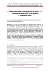 Actas – IV Congreso Internacional Latina de Comunicación Social – IV CILCS – Universidad de La Laguna, diciembre 2012 Consideraciones Pedagógicas en torno a la Diversidad Mediática en el Mundo Contemporáneo Mtra. Patricia Romero Barajas. Universidad Nacional Autónoma de México. [email protected] Resumen: En el Mundo Contemporáneo, el profesional de la pedagogía no solo debe dominar los saberes didácticos y disciplinares propios de su campo de conocimiento, también debe incorporar habilidades tecnológicas y de búsqueda, acceso, producción y gestión de información para perfilarse como un profesional inmerso en los medios de comunicación que conllevan formas y recursos cada vez más variados y complejos, propiciados justamente por la diversidad mediática, en la que se construyen relaciones y conocimiento en Comunidades de práctica y Redes Sociales de Conocimiento. Es así que en la Sociedad de la Información, la comunicación y el conocimiento; la transmisión, almacenamiento, procesamiento y control de la información, ha rebasado los límites y parámetros conocidos. La comunicación se establece por canales múltiples, que reducen las limitaciones del espacio y el tiempo, inclusive podríamos hablar de la transformación en las dos últimas décadas, de los modos de ser y hacer de la educación. 1. Introducción El siglo XXI nos sorprende por caracterizarse como la era digital1, el ambiente del ciberespacio las comunicaciones con personas de todas partes del mundo, así como la conformación de Comunidades y Redes Sociales2 que comparten e interactúan más allá del tiempo y el espacio. La formación profesional del Pedagogo en este contexto, demanda un replanteamiento y resignificación de saberes, debido a tres fenómenos que impactan su ámbito de acción profesional, a saber: La incorporación de las Tecnologías de Información y Comunicación (TIC) en todas las esferas del conocimiento, la emergencia de 1 Xabier, Barandiarán 2003. La era digital (en su doble vertiente de digitalización y manipulación digital) permite desacoplar los procesos de percepción y acción introduciendo un espacio intermedio altamente (re)configurable y manipulable; i.e. la digitalización permite el surgimiento de un espacio informacional abierto a quien tenga acceso a las interfaces digitales (terminales, conexiones, etc.) En http://espora.org/biblioweb/cultura/digital.html 2 Las Redes Sociales (RS) son formas de interacción social, definida como un intercambio dinámico entre personas, grupos e instituciones en contextos de complejidad. Un sistema abierto y en construcción permanente que involucra a conjuntos de personas que se identifican en las mismas necesidades y problemáticas y que se organizan para potenciar sus recursos. ISBN-13: 978-84-15698-06-7 / D.L.: TF-969-2012 Página 1 Actas on-line: http://www.revistalatinacs.org/12SLCS/2012_actas.html Actas – IV Congreso Internacional Latina de Comunicación Social – IV CILCS – Universidad de La Laguna, diciembre 2012 un aprendizaje a distancia mediado por tecnología y las tendencias educativas actuales a nivel global, de migrar a un Modelo Educativo basado en Competencias teniendo como escenario el Modernismo y Posmodernismo que modelan las sociedades en todo el Planeta. Aunado a lo anterior, la visión de la Pedagogía en el Mundo Contemporáneo, como en otros momentos históricos, gira en torno al abordaje de problemas complejos propios de la naturaleza humana y las sociedades que conforman (tanto locales como globales) que involucran un modo de pensar, basado en la contextualización del saber, la multidimensionalidad de la realidad, la comprensión de aquello que se quiere conocer e intervenir: el fenómeno educativo en toda su dimensión y complejidad y la capacidad de enfrentar la incertidumbre asumiendo una postura ética, contemplando la necesidad de configurar un pensamiento comunitario y planetario (Morín, 2001) desde la visión del pensamiento complejo. 2. Realidad educativa compleja multimodal Hoy día coexisten tres tipos de Modalidades en los Sistemas educativos de las Instituciones de Educación Superior (IES), a saber: presencial, basada en la relación Cara a Cara, la educación a distancia con modalidades que pueden incluir medios impresos, digitales y ambientes virtuales mediados por tecnología, derivando en ambientes mixtos de aprendizaje y la educación en línea o virtual. En todas ellas, los medios de información y comunicación juegan un papel preponderante al grado de que se podría afirmar que no hay educación sin comunicación y que la educación está sufriendo transformaciones a medida que los soportes y medios de información y comunicación (radio, teléfono, televisión, video, Internet, Web 2.0, La Nube) van evolucionando y tomando su lugar en el ámbito educativo. De ello se deriva que en el Mundo Contemporáneo, el profesional de la pedagogía no solo debe dominar los saberes didácticos y disciplinares, sino que en su formación académica, debe incorporar habilidades tecnológicas y de búsqueda de información con base en los Modelos de Competencias en el Manejo de Información (CMI)3 para perfilarse como un profesional inmerso en los medios de comunicación, en los cuales se generan ambientes de aprendizaje y se desarrolla la práctica profesional. La Diversidad Mediática en el Mundo Contemporáneo desde la óptica pedagógica, nos conduce a las siguientes reflexiones: En primera instancia, plantearnos la formación y el campo de acción profesional del pedagogo en este escenario, nos remite a aceptar que uno de los principales problemas derivados de la globalización al que se enfrentan los sistemas educativos actuales, radica en la perpetuación de las prácticas convencionales con tecnología o sin ella y la falta de capacidad para adaptarse al cambio dadas las jerarquías en que se sustentan, por lo que las estructuras 3 CMI. Se puede definir como las habilidades, co