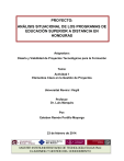 PROYECTO: ANÁLISIS SITUACIONAL DE LOS PROGRAMAS DE EDUCACIÓN SUPERIOR A DISTANCIA EN HONDURAS Asignatura: Diseño y Viabilidad de Proyectos Tecnológicos para la Formación Tema: Actividad 1 Elementos Clave en la Gestión de Proyectos Universitat Rovira i Virgili Profesor: Dr. Luís Marqués Por: Esteban Ramón Portillo Mayorga 23 de febrero de 2014. 1 Tabla de contenido Resumen .................................................................................................................................................. 3 Planteamiento y Justificación del problema. ................................................................................. 4 Descripción de elementos que justifican el problema. ................................................................... 4 Estado del Arte ..................................................................................................................................... 4 Contexto en el que se enmarca el proyecto ................................................................................... 6 Objetivos. ................................................................................................................................................. 7 Objetivo General ................................................................................................................................ 7 Objetivos específicos ....................................................................................................................... 7 Beneficios esperados ........................................................................................................................... 8 Metodología: ........................................................................................................................................... 8 Planificación............................................................................................................................................ 9 Cronograma ......................................................................................................................................10 Recursos ............................................................................................................................................11 Presupuesto ......................................................................................................................................11 Evaluación .........................................................................................................................................12 Cierre ...................................................................................................................................................12 Bibliografía ............................................................................................................................................13 ÍNDICE DE CUADROS: Cuadro 1. Planificación de actividades ................................................................................................ 9 Cuadro 2. Cronograma de actividades. .............................................................................................10 Cuadro 3 Detalle de recursos previstos. ............................................................................................11 Cuadro 4. Presupuesto estimado para la realización del proyecto. ..............................................11 2 Resumen Con la realización del presente proyecto se pretende conocer, con algún detalle la realidad actual de la educación a distancia en Honduras así como sus perspectivas. La intención anterior surge del interés de un grupo de inversionistas que han intuido una oportunidad de negocio al observar que la crisis económica mundial está limitando el acceso a la educación superior a muchas personas. Piensan que se puede proporcionar un servicio de educación virtual a este potencial mercado, con precios competitivos en comparación con la modalidad de estudio presencial. Han tomado la decisión de, que previamente a la realización de un estudio de factibilidad para crear un centro de educación superior virtual, realizar un análisis situacional de la educación superior a distancia en el país. Además para emprender cualquier curso de acción en lo referente a la educación virtual, se necesita conocer bien el punto de partida, que permita hacer una planificación bien fundamentada, y disponer de una base de comparación para evaluaciones futuras. Se planificaron tres fases: 1) Formulación teórica, 2) Trabajo de campo y 3) Sistematización y Elaboración del Documento Final. El perfil temporal del proyecto es de cinco meses de febrero a junio de 2014. Los costos para la realización del proyecto se estiman en US$ 12,205.00 (doce mil doscientos cinco dólares). Se espera beneficiar tanto a la población estudiantil para facilitar su acceso como a los potenciales inversionistas al entregar un análisis situacional de la educación a distancia de Honduras. 3 Planteamiento y Justificación del problema. Descripción de elementos que justifican el problema. En vista de que el contexto económico mundial actual, donde casi la generalidad de los países atraviesa por un ciclo económico recesivo, situación ésta, que dificulta la accesibilidad de muchos estudiantes, para cursar estudios superiores (Álvarez Pérez, Cabrera Pérez, González Afonso, & Bethencourt Benítez, 2006), un grupo de personas, integrado por profesionales de la educación, administradores de empresas, e inversionistas privados—quienes, de momento, han solicitado anonimato— desean aprovechar esta coyuntura, para facilitar a estos prospectos, una oportunidad para acceder a los estudios superiores, con un coste menor, a través de la creación de un centro de educación superior virtual en Honduras. Para este propósito, se plantea la necesidad de un estudio situacional de la educación virtual superior en Honduras, por medio del cual se pr