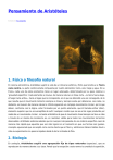 Pensamiento de Aristóteles Extraído de Escuelapedia 1. Física o filosofía natural En ciencia astronómica, Aristóteles sugirió la vida de un Universo esférico y finito que tendría a la Tierra como centro. La parte central estaría compuesta por cuatro elementos: tierra, aire, fuego y agua. En su Física, cada uno de estos elementos tiene un lugar adecuado, determinado por su peso relativo o ‘gravedad específica’. Cada elemento se mueve, de manera natural, en línea recta —la tierra hacia abajo, el fuego hacia arriba— hacia el lugar que le corresponde, en el que se detendrá una vez conseguido, de lo que resulta que el movimiento terrestre siempre es lineal y siempre acaba por detenerse. Los cielos, no obstante, se mueven de manera natural e infinita siguiendo un complejo movimiento circular, por lo que deben, conforme con la lógica, estar formados por un quinto elemento, que él llamaba aither (éter), elemento superior que no es susceptible de sufrir cualquier cambio que no sea el de lugar producido por medio de un movimiento circular. La teoría aristotélica de que el movimiento lineal siempre se lleva a cabo a través de un medio de resistencia es, en realidad, válida para todos los movimientos terrestres observables. Aristóteles sostenía además que los cuerpos más pesados de una materia específica caen de manera más rápida que aquellos que son más ligeros en el momento en que sus formas son iguales, concepto equivocado que se aceptó como norma hasta que el físico y astrónomo italiano Galileo llevó a cabo su experimento con pesos arrojados desde la torre inclinada de Pisa. 2. Biología En zoología, Aristóteles sugirió una agrupación fija de tipos naturales (especies), que se reproducen de manera devoto a su clase. Pensó que la excepción a esta norma la constituía la aparición, por descendencia natural (concepto que acuñó), de algunas moscas y gusanos ‘muy inferiores’ a partir de fruta en descomposición o estiércol. Los ciclos cruciales tradicionales son epiciclos: se repite el mismo patrón, aunque a través de una sucesión lineal de individuos. Dichos procesos son, por lo tanto, un paso intermedio entre los círculos inmutables de los cielos y los simples movimientos lineales de los elementos terrestres. Las especies forman una escala que entiende desde lo simple (con gusanos y moscas en el raso inferior) hasta lo complejo (con los seres humanos en el raso superior), aunque la evolución no es posible. 3. Ética Aristóteles creía que la libertad de elección del individuo hacía imposible un análisis necesario y completo de las cuestiones humanas, con lo que las ‘ciencias prácticas’, como la política o la ética, se llamaban ciencias sólo por cortesía y analogía. Las limitaciones inherentes a las ciencias prácticas quedan aclaradas en los conceptos aristotélicos de naturaleza humana y autorrealización. La naturaleza humana implica, para todos, una aptitud para formar hábitos, sin embargo los hábitos formados por un individuo en específico dependen de la cultura y de las opciones personales repetidas de ese individuo. Todos los seres humanos anhelan la ‘placidez’, esto es, una realización activa y comprometida de sus aptitudes innatas, aunque este propósito puede ser conseguido por muchos trayectos. La Ética a Nicómaco es un análisis de la relación del carácter y la inteligencia con la placidez. Aristóteles distinguía dos tipos de ‘virtud’ o excelencia humana: moral e intelectual. La virtud moral es una expresión del carácter, producto de los hábitos que evidencian opciones repetidas. Una virtud moral siempre es el punto medio entre dos extremos menos deseables. El valor, por ejemplo, es el punto intermedio entre la cobardía y la impetuosidad irreflexiva; la dadivosidad, por otro lado, constituiría el punto intermedio entre el derroche y la tacañería. Las virtudes intelectuales, no obstante, no están sujetas a estas doctrinas de punto intermedio. La ética aristotélica es una ética elitista: para él, la plena excelencia sólo puede ser alcanzada por el varón adulto y maduro perteneciente a la clase alta y no por las mujeres, niños, ‘bárbaros’ (no griegos) o ‘mecánicos’ asalariados (trabajadores manuales, a los cuales negaba el derecho al voto). Como es obvio, en política es posible encontrar muchas formas de asociación humana. Decidir cuál es la más idónea dependerá de las circunstancias, como, por ejemplo, los recursos naturales, la industria, las tradiciones culturales y el grado de alfabetización de cada comunidad. Para Aristóteles, la política no era un estudio de los estados ideales en forma abstracta, sino un examen del modo en que los ideales, las leyes, las tradiciones y las propiedades se interrelacionan en los casos reales. De este modo, aunque aprobaba la fundación de la esclavitud, moderaba su aceptación aduciendo que los amos no debían sacar provecho de su autoridad, ya que los intereses de amo y prisionero son los mismos. La biblioteca del Liceo contenía una colección de 158 constituciones, tanto de estados griegos como extranjeros. El propio Aristóteles escribió la Constitución de Atenas como parte de la colección, obra que estuvo perdida hasta 1890, año en que fue recobrada. Los historiadores han encontrado en este texto muy valiosos datos para reformar algunas fases de la historia ateniense. 4. Lógica En lógica, Aristóteles desarrolló normas para establecer un razonamiento encadenado que, si se respetaban, no llevarían jamás a falsas conclusiones si la reflexión partía de premisas auténticas (normas de validez). En el razonamiento los nexos básicos eran los silogismos: proposiciones emparejadas que, en su agrupación, suministraban una nueva terminación. En el ejemplo más famoso, ‘Todos los humanos son mortales’ y ‘Todos los griegos son humanos’, se llega a la terminación válida de que ‘Todos los griegos son mortales’.