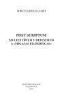 SØREN KIERKEGAARD POST SCRIPTUM NO CIENTÍFICO Y DEFINITIVO A «MIGAJAS FILOSÓFICAS» EDICIONES SÍGUEME SALAMANCA 2010 Esta obra ha sido publicada gracias a la ayuda concedida por el Danish Arts Council’s Committee for Literature - Kunstrådets Litteraturudvalg. Esta obra ha sido publicada con una subvención de la Dirección General del Libro, Archivos y Bibliotecas del Ministerio de Cultura para su préstamo público en Bibliotecas Públicas, de acuerdo con lo previsto en el artículo 37.2 de la Ley de Propiedad Intelectual. Cubierta diseñada por Christian Hugo Martín © Traducción de Javier Teira y Nekane Legarreta sobre el original danés Afsluttende uvidenskabelig Efterskrift til de philosophiske Smuler (1846) © Ediciones Sígueme S.A.U., 2010 C/ García Tejado, 23-27 - E-37007 Salamanca / España Tlf.: (34) 923 218 203 - Fax: (34) 923 270 563 [email protected] www.sigueme.es ISBN: 978-84-301-1756-7 Depósito legal: S. 1612-2010 Impreso en España / Unión Europea Gráficas Varona S.A. CONTENIDO Prefacio ....................................................................................... 17 Introducción ................................................................................ 21 Primera parte El problema objetivo de la verdad del cristianismo Capítulo 1. La consideración histórica ...................................... 35 § 1. La Sagrada Escritura ................................................................. 36 § 2. Acerca de la Iglesia .................................................................... 46 § 3. La prueba de los siglos para la verdad del cristianismo ............. 58 Capítulo 2. La consideración especulativa ................................ 61 Segunda parte El problema subjetivo. La relación del sujeto con la verdad del cristianismo, o llegar a ser cristiano Primera sección. Algo sobre Lessing Capítulo 1. Expresión de agradecimiento a Lessing ................. 71 Capítulo 2. Tesis posibles y reales sobre Lessing ..................... 81 1. El pensador subjetivo existente presta atención a la dialéctica de la comunicación ...................................................... 82 2. El pensador subjetivo existente, en su relación existencial con la verdad, es tan negativo como positivo, es cómico en la misma medida en que posee esencialmente pathos, y se encuentra constantemente en devenir, es decir, en tensión 89. 89 3. Lessing ha dicho que verdades históricas contingentes jamás pueden llegar a ser demostraciones de verdades eternas de razón ..........................................................................102 4. Lessing ha dicho: «Si Dios tuviera empuñada en su dies- tra toda la verdad y en su siniestra el impulso siempre inquieto por buscarla… yo me inclinaría humildemente a su siniestra» .................................................................... 114 Segunda sección. El problema subjetivo, o cuál debe ser la índole de la subjetividad para que el problema pueda mostrársele Capítulo 1. Llegar a ser subjetivo ............................................. 133 Capítulo 2. La verdad subjetiva, la interioridad; la verdad es la subjetividad ............................................................................ 191 Apéndice. Ojeada a un esfuerzo contemporáneo en la literatura danesa ......................................................................... 251 Capítulo 3. Subjetividad real, subjetividad ética; el pensador subjetivo .................................................................................. 299 § 1.Lo que significa existir; realidad ............................................... 299 § 2. Posibilidad superior a la realidad. Realidad superior a la posibilidad. La idealidad poética e intelectual; la idealidad ética .... 315 § 3. La contemporaneidad de los elementos particulares de la sub­ jetividad en el individuo subjetivo existente; la contempora­neidad como lo opuesto al proceso especulativo ........................... 338 § 4. El pensador subjetivo; su tarea; su forma, su estilo .................. 344 Capítulo 4. El problema en Migajas: ¿Cómo puede una salvación eterna construirse sobre el conocimiento histórico? ......355 División I. Para orientación en el plan de Migajas ................. 355 § 1. El punto de partida fue tomado en el paganismo, y por qué . 355 § 2. Importancia de un acuerdo previo sobre lo que es el Cristianismo antes de plantear cualquier cuestión relacionada con la mediación entre el cristianismo y el pensamiento es­peculativo; la ausencia de acuerdo favorece la mediación, aunque su ausencia haga de la mediación algo ilusorio; el se­ guimiento de un acuerdo previene la mediación .................. 362 § 3. El asunto en Migajas como asunto introductorio no del cristianismo, sino a convertirse en cristiano ................................ 374 División 2. El problema en sí ................................................. 378 La salvación eterna del individuo se decide en el tiempo mediante una relación con algo histórico que además es histórico de modo que por su esencia no puede volverse histórico y consecuentemente debe volverse tal en virtud de lo absurdo ....................... 378 A. Pathos . ......................................................................... 380 § 1. La manifestación inicial del pathos existencial, la orientación (el respeto) absoluta hacia el télo$ absoluto manifestado en la acción que transforma la existencia – Pathos estético – La mediación intoxicada de eternidad – El movimiento monástico de la Edad Media – Simultáneamente estar relacionándose absolutamente con el propio télo$ absoluto y relativamente con fines relativos ..................... § 2. La expresión esencial del pathos existencial: el sufrimiento – Fortuna y desgracia como visión de vida estética en contraste con el sufrimiento como concepción religiosa de la vida (ilustrado mediante el discurso