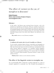 02 IBERICA 17.qxp:Iberica 13 27/03/09 7:48 Página 11 The effect of context on the use of metaphor in discourse1 Zoltán Kövecses Eötvös Loránd University, Budapest (Hungary) [email protected] Abstract In this article, I will discuss some contextual factors that play a role in the production of metaphors in real discourse. There are a number of such factors that have this effect (see Kövecses, forthcoming). They include the following: (1) the immediate linguistic context itself, (2) what we know about the major entities participating in the discourse, (3) physical setting, (4) social setting, and (5) the immediate cultural context. This article will be limited to the discussion of the first two. Key words: context, co-text, discourse, metaphor. Resumen La influencia del contexto sobre el uso de la metáfora en el discurso En este artículo examinaré algunos factores contextuales que desempeñan un papel a la hora de generar el uso de metáforas en la construcción del discurso. Hay varios factores que tienen este efecto (ver Kövecses, en preparación). Entre dichos factores, figuran los siguientes: 1) el inmediato contexto lingüístico propiamente dicho, 2) lo que sabemos al respecto de las entidades principales que operan en la generación del discurso, 3) el entorno físico, 4) el entorno social, 5) el contexto cultural inmediato. El presente artículo se ceñirá a los dos primeros factores. Palabras clave: contexto, co-texto, discurso, metáfora. The effect of the linguistic context on metaphor use Let us provisionally think of discourse as being composed of a series of concepts organized in a particular way. The concepts that participate in ibérica 17 [2009]: 11-24 11 02 IBERICA 17.qxp:Iberica 13 27/03/09 7:48 Página 12 ZoLTán KövEcSES discourse may give rise to either conventional or unconventional and novel linguistic metaphors. Suppose, for example, that we talk about the progress of a particular process and want to say that the progress has become more intense. There are many ways in which this can be done. We can say that the progress “accelerates”, “speeds up”, “gains momentum”, “moves faster”, “picks up” or “gathers speed”, and many others. These are all relatively “conventional” ways of talking about an increase in the intensity of a process. They are all based on the conventional generic-level mapping InTEnSITy IS SpEEd, as it applies to the concept of progress (in relation to a process). The larger metaphors within which the mapping InTEnSITy IS SpEEd works are also well established ones: progrESS IS moTIon forWard and, even more generally, EvEnTS arE movEmEnTS. However, the particular concepts that refer to the specific process we are talking about may influence the selection of the linguistic metaphorical expression in talking about the intensity of the progress at hand. The linguistic metaphors we actually use may be much “less conventional” than the ones mentioned above. as an example, consider a headline from The Wall Street Journal Europe (6 Jan. 2003). It reads (taken from Kövecses (2005) and reanalyzed here): The americanization of Japan’s car industry shifts into higher gear. Here, the process is the americanization of Japan’s car industry and the suggestion is that it has become, or is becoming, more intense. Instead of describing the property of “increase in intensity” by any of the conventional linguistic metaphors above, or, as a matter of fact, by a large number of additional ones that could be used (such as “galloping ahead”), the author uses the relatively unconventional linguistic metaphor “shifts into higher gear” (which is also an instance of the general metonymy acTIon for rESuLT, where shifting into higher gear results in higher speed, that is, we have SHIfTIng gEar for goIng faSTEr). Such headlines are also discussed by White and Herrera (2009). I propose that this particular expression is selected because of the influence of the immediate linguistic context, that is, the concepts that surround the conceptual slot where we need an expression to talk about “an increase in intensity” (of the progress of a process). Since the process is that of the americanization of Japan’s “car” industry, we find it natural and highly motivated that the author of the utterance uses the expression “shifts into 12 ibérica 17 [2009]: 11-24 02 IBERICA 17.qxp:Iberica 13 27/03/09 7:48 Página 13 THE EffEcT of conTExT higher gear” in that conceptual slot in the discourse. Since the surrounding context includes the car industry, it makes sense to use the motion of a car, and not the motion of some other entity capable of motion, in the metaphor. It seems to me that the pressure of coherence (i.e., trying to be coherent with the linguistic context) is at work here. Jean aitchison (1987) made an interesting observation that bears on this issue. She noted that in newspaper articles and headlines about (american) football games, the names of the teams may select particular metaphors for defeat and victory. She found such examples as follows in the sports pages of american newspapers: “cougars drown Beavers,” “cowboys corral Buffaloes,” “air force torpedoes the navy,” “clemson cooks rice” (aitchison, 1987: 143). metaphors used in these sentences are selected on the basis of the names of football teams. Since beavers live in water, defeat can be metaphorically viewed as drowning; since cowboys corral cattle, the opponent can be corralled; since navy ships can be torpedoed, the opponent can be torpedoed, too; and since rice can be cooked, the same process can be used to describe the defeat of the opponent. The metaphors in the above sentences indicate that the target domain of dEfEaT can be variously expressed as “drowning”, “corralling”, etc., the choice depending on the concepts (in this case, corresponding to the names of the teams) that make up the utterances in which the metaphor 