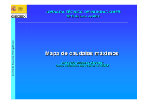 MINISTERIO DE FOMENTO MINISTERIO DE MEDIO AMBIENTE JORNADA T ÉCNICA DE INUNDACIONES TÉCNICA Centro de Estudios Hidrográficos 10 -11 de 10-11 de junio junio de de 2010 2010 Mapa de caudales m áximos máximos Antonio Jiménez Álvarez Centro Centro de de Estudios Estudios Hidrográficos Hidrográficos del del CEDEX CEDEX 1 MINISTERIO DE FOMENTO MINISTERIO DE MEDIO AMBIENTE CARACTER ÍSTICAS GENERALES DEL CARACTERÍSTICAS TRABAJO •Realizado dentro de un Convenio de colaboración entre el MARM y el CEDEX. •Características generales de los mapas: Centro de Estudios Hidrográficos Realizado en el ámbito de las cuencas gestionadas por las distintas Confederaciones Hidrográficas. Proporcionan información en los puntos de la red fluvial con cuencas iguales o superiores a 50 km2. Correspondientes al régimen natural. Proporcionan información para los periodos de retorno: 2, 5, 10, 25, 100 y 500 años. Estimación orientativa de la MCO a partir de fórmulas aproximadas. Los resultados se representan mediante capas raster con resolución de 500x500 m. Se ha elaborado una aplicación informática para facilitar la consulta y visualización de los mapas. 2 •Se adoptó como cuenca piloto del trabajo la cuenca del Tajo. MINISTERIO DE FOMENTO MINISTERIO DE MEDIO AMBIENTE PROCESO DE ELABORACI ÓN DE LOS ELABORACIÓN MAPAS •Selecció Selección y tratamiento de las series de caudales má máximos anuales medidas en estaciones de aforos y embalses. Centro de Estudios Hidrográficos OBTENCIÓN DE LOS CUANTILES DE CAUDAL MÁXIMO EN LOS PUNTOS AFORADOS ESTIMACIÓN DE LOS CUANTILES EN LOS PUNTOS NO AFORADOS A PARTIR DEL PASO ANTERIOR 3 GENERACIÓN Y TRATAMIENTO DE LAS CAPAS SIG CON LOS RESULTADOS • Aná Análisis de las funciones de distribució distribución y procedimientos de estimació estimación má más adecuados. • Incorporació Incorporación de informació información regional e histó histórica para mejorar la extrapolació extrapolación a altos periodos de retorno. •Selecció Selección de los modelos a utilizar. • Elaboració Elaboración de capas de variables y pará parámetros. • Calibració Calibración y ajuste de los modelos. MINISTERIO DE FOMENTO MINISTERIO DE MEDIO AMBIENTE SELECCI ÓN DE LAS SERIES DE SELECCIÓN CAUDALES M ÁXIMOS MÁXIMOS •Tipos de puntos de medida considerados: Estaciones de aforos de la ROEA. Centro de Estudios Hidrográficos Embalses. Estaciones SAIH. •Criterio de selección: Mínimo de 20 datos de caudal máximo medio diario (15 en zonas con pocas estaciones). No afectadas significativamente por la presencia de embalses aguas arriba: Porcentaje de la cuenca controlada por embalses menor del 10%. Volumen de embalse menor del 10% del volumen de avenida. 4 Puntos de medida seleccionados MINISTERIO DE FOMENTO MINISTERIO DE MEDIO AMBIENTE TRATAMIENTO DE LAS SERIES DE CAUDALES M ÁXIMOS MÁXIMOS Centro de Estudios Hidrográficos En algunas estaciones y algunos periodos de registro solo se dispone del caudal máximo medio diario y no del caudal máximo instantáneo. 1000 Caudal 800 600 400 200 0 0 1 2 3 4 Tiempo (días) 5 5 6 7 MINISTERIO DE FOMENTO MINISTERIO DE MEDIO AMBIENTE TRATAMIENTO DE LAS SERIES DE CAUDALES M ÁXIMOS MÁXIMOS Procedimiento de obtención del caudal máximo instantáneo a partir del medio diario: Centro de Estudios Hidrográficos Estaciones con datos instantáneos incompletos. Estaciones sin información sobre caudales máximos instantáneos: Se ha aplicado la fórmula de Fuller. Calibración regional de los parámetros de la ecuación. 1,00 24 y = -0,3764x + 0,6996 R 2 = 0,5323 Caudal instantáneo (m3/s) 0,75 20 0,50 16 0,25 0,00 12 0,00 8 -0,75 0 -1,00 2 4 6 8 10 12 14 1,00 1,50 2,00 2,50 3,00 3,50 4,00 4,50 5,00 -0,50 4 0 0,50 -0,25 y = 1,4171x R2 = 0,8956 16 -1,25 ⎛ 6.38 ⎞ Qi = ⎜1 + 0.41 ⎟Qd ⎝ A ⎠ Caudal medio diario (m3/s) -1,50 6 Relació Relación entre caudales má máximos medios diarios e instantá instantáneos. Estaciones con datos instantá instantáneos incompletos. Ajuste de la ecuació ecuación de Fuller en la cuenca del Tajo MINISTERIO DE FOMENTO MINISTERIO DE MEDIO AMBIENTE REVISI ÓN DE LA CALIDAD DE LAS SERIES REVISIÓN DE DATOS •Identificación de tendencias temporales en las series. Centro de Estudios Hidrográficos •Análisis de inconsistencias con los datos de otras estaciones situadas aguas arriba o aguas abajo. •Identificación de datos anómalos (outliers). 4157 Area 4919 66,5 119 9000 1927/28 76,96 17,71 1928/29 71,40 17,71 8000 1929/30 83,12 23,28 7000 1930/31 47,36 55,66 6000 1932/33 117,96 5000 1933/34 18,38 11,13 1934/35 35,67 19,48 1935/36 88,68 59,20 3 Caudal acumulado (m /s) Estación 3234. Jaraiz de la Vera 1931/32 103,60 4000 3000 1936/37 81,87 317,52 2000 1937/38 75,78 226,94 1938/39 1000 1939/40 88,80 400 0 0 5 10 15 20 25 350 Estación 4919 C a u d a l in s ta n tá n e o m á x im o Tiempo (años) Estación 3163. Piedras Albas 3 Caudal acumulado (m /s) 6000 7 Estación 4157 5000 300 250 200 150 100 4000 1940/41 93,24 64,77 1941/42 60,80 41,49 1942/43 48,10 33,65 1943/44 50,91 23,53 1944/45 65,65 29,85 1945/46 93,24 50,85 1946/47 68,14 45,29 1947/48 57,48 41,75 1948/49 91,35 30,36 1949/50 34,04 29,35 1950/51 63,28 28,84 1951/52 81,99 48,83 1952/53 82,29 51,11 1953/54 62,16 45,03 1954/55 35,93 1955/56 32,15 3000 50 2000 1956/57 0 Variable transformada 1000 0 0 5 10 15 20 Tiempo (años) 25 30 28,08 7,40 6,83 1957/58 14,50 10,12 MINISTERIO DE FOMENTO MINISTERIO DE MEDIO AMBIENTE AJUSTE DE LAS FUNCIONES DE DISTRIBUCI ÓN DISTRIBUCIÓN •Análisis de las funciones de distribución y de los procedimientos de ajuste más idóneos. Centro de Estudios Hidrográficos Análisis de la capacidad de las funciones para adaptarse a los datos de las muestras (capacidad descriptiva). Análisis de la precisión y robustez de las funciones para extrapolar a altos periodos de retorno (capacidad predictiva). •Utilización de información adicional para mejorar la extrapolación a