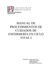 ESCUELA DE ENFERMERIA SEDE CHILLAN MANUAL DE PROCEDIMIENTOS DE CUIDADOS DE ENFERMERÍA EN CICLO VITAL I DOCENTES: CAROLINA TORO ERIKA SEPULVEDA JORGE GARCIA ALEJANDRO ASTUDILLO MANUAL DE PROCEDIMIENTOS DE CUIDADOS DE ENFERMERÍA EN CICLO VITAL I INDICE 1. INTRODUCCIÓN……………………………………………………pag. 3 2. TALLER DE LAVADO DE MANOS CLINICO……………………pag. 4 3. TALLER DE VALORACIÓN: Valoración Física,…………………pag. 6 4. TALLER DE ENTREVISTA AL USUARIO………………………..pag. 13 5. ESCALA DE GLASGOW……………………………………………pag. 15 6. TALLER DE COLOCACIÓN DE GUANTES ESTÉRILES………pag. 16 7. TALLER DE COLOCACIÓN DE DELANTAL,…………………….pag. 16 8. TALLER DE CONTROL DE SIGNOS VITALES……………… pag. 18 9. TALLER DE MEDICIÓN DE DIURESIS………………………… pag. 28 10. TALLER DE ASEO DE CAVIDADES…………………………… pag. 29 11. TALLER DE CONFECCIÓN DE CAMA………………………… pag. 33 12. TALLER DE ASEO MATINAL……………………………………. pag. 38 13. TALLER DE PREVENCIÓN DE ULCERAS POR PRESIÓN……pag. 46 14. TERMINOLOGÍAS MEDICAS………………………………………pag. 56 15. TERMINOLOGÍAS DE INFECCION INTRAHOSPITALARIAS………………………………… UNIVERSIDAD PEDRO DE VALDIVIA – ESCUELA DE ENFERMERÍA pag. 58 2 MANUAL DE PROCEDIMIENTOS DE CUIDADOS DE ENFERMERÍA EN CICLO VITAL I INTRODUCCIÓN La esencia del profesional de Enfermería es el CUIDAR, el cual se ejecuta a través de varias intervenciones de enfermería, las cuales están dirigidas al individuo con afecciones física reales o potenciales con el fin de mejorar o aliviar dichas molestias generadas por el proceso patológico, por esto el profesional de enfermería debe poseer el conocimiento y capacidades técnicas e intelectuales para resolver aquellas necesidades básicas, comunicarse y reflexionar sobre aquellos problemas que afectan a los usuarios. Es por esto que la (el) Enfermera(o) debe realizar una serie de intervenciones de forma oportuna para mantener el bienestar físico y mental del usuario partiendo por aquellas necesidades más básicas insatisfechas como por ejemplo: aseo, movilización, prevención de UPP, etc destinadas a aquellos usuarios que no lo puedan realizar por si mismo y que están sujetas a las condiciones de salud de este. Este manual esta creado para los alumnos del 2º nivel de la carrera de Enfermería, asignatura Cuidados de Enfermería en Ciclo Vital I, el cual, comprende todas las técnicas básicas realizadas y/o supervisadas por el profesional de Enfermería durante su desempeño laboral. UNIVERSIDAD PEDRO DE VALDIVIA – ESCUELA DE ENFERMERÍA 3 MANUAL DE PROCEDIMIENTOS DE CUIDADOS DE ENFERMERÍA EN CICLO VITAL I TALLER DE LAVADO DE MANOS CLINICO Definición: Es el procedimiento que se efectúa para eliminar la Flora Microbiana Transitoria y reducir la Flora Microbiana Permanente de las manos por medios mecánicos y químicos. Es un frotado breve y vigoroso de todas las superficies de las manos entre si, cubiertas de jabón, seguido de un aclarado bajo la corriente de agua. CONCEPTOS GENERALES: Las manos de los trabajadores de la salud pueden transmitir gran cantidad de microorganismos sin darnos cuenta de ello, y por esto, los usuarios están más expuestos a adquirir infecciones nosocomiales. Es una técnica más básica de prevención y control de infecciones intrahospitalarias (IIH) y una de las prácticas de antisepsia mas importantes, ya que las manos son el principal vehículo de contaminación exógena de las IIH. El lavado de manos clínico se realiza siempre que se den las siguientes circunstancias. • Al ingresar al Servicio Clínico • Antes y después de realizar cualquier procedimiento al paciente • Después de tener contacto con una fuente de microorganismos • Antes y después de comer • Después de ir al WC • Después de sonarse la nariz • Cuando las manos están visiblemente sucias • Siempre que se utilicen guantes • Al retirarse del Servicio Clínico - Se utilizan medios mecánicos y químicos destructores de microorganismos y el tiempo requerido para lograr una buena asepsia médica es de 2 a 3 minutos. - El lavado de manos incluye todo el antebrazo y aseo minucioso de las uñas. - El uso de guantes no reemplaza el lavado de manos - Las manos contaminadas son la principal causa de infección cruzada de enfermedades infectocontagiosas. - Examinarse las manos en busca de lesiones y cubrir previamente a la atención al cliente. Las lesiones pueden alojar una gran concentración de microorganismos. - Uñas cortas y bien limitadas. La mayor cantidad de microorganismos provienen debajo de las uñas. - Valorar el riesgo del usuario o susceptibilidad a las enfermedades (inmunodeprimido) para lo cual usar jabón antimicrobiano. - Uso de delantal o uniforme de manga corta, o subirlas hasta el codo. Lavado de manos post atención del usuario: Si las manos están secas o agrietadas aplicar pequeña cantidad de loción protectora. En visitas a domicilio: Anticiparse ante la necesidad de disponer de un producto alternativo. Ej Alcohol gel. UNIVERSIDAD PEDRO DE VALDIVIA – ESCUELA DE ENFERMERÍA 4 MANUAL DE PROCEDIMIENTOS DE CUIDADOS DE ENFERMERÍA EN CICLO VITAL I OBJETIVOS: 1. Conocer la correcta técnica de lavado de manos 2. Realizar lavado de manos según técnica 3. Eliminar la flora microbiana transitoria de la piel de las manos 4. Disminuir la flora microbiana residente de la piel de las manos 5. Limitar la diseminación de microorganismos especialmente la transferencia de estos, de una persona a otra a través de las manos. 6. Disminuir la posibilidad de infecciones dérmicas en las manos EQUIPO: - Lavamanos (idealmente de pedal) - Jabón (de preferencia jabón liquido en dispensador) - Toalla desechable - Recipiente para material de desecho PROCEDIMIENTO: 1. Súbase las mangas