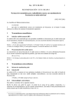 Rec. UIT-R BS.450-3 1 RECOMENDACIÓN UIT-R BS.450-3 Normas de transmisión para radiodifusión sonora con modulación de frecuencia en ondas métricas* (1982-1995-2001) La Asamblea de Radiocomunicaciones, recomienda 1 que para la radiodifusión sonora con modulación de frecuencia en la banda 8 (ondas métricas) se utilicen las normas de transmisión siguientes: 1 Transmisiones monofónicas 1.1 Señal de radiofrecuencia (RF) La señal de RF está constituida por una portadora modulada en frecuencia por la señal sonora que ha de transmitirse, después de la preacentuación, con una excursión máxima de frecuencia igual a: ± 75 kHz o ± 50 kHz. NOTA 1 – En los países de Europa Occidental y en Estados Unidos de América, la excursión máxima es de ± 75 kHz. En la antigua URSS y en otros países europeos, la excursión máxima es de ± 50 kHz. 1.2 Preacentuación de la señal sonora La característica de preacentuación de la señal sonora es idéntica a la curva admitancia-frecuencia de un circuito resistencia-capacidad en paralelo, que tiene una constante de tiempo de: 50 µs ó 75 µs. NOTA 2 – En Europa, la preacentuación es de 50 µs. En Estados Unidos de América, la preacentuación es de 75 µs. 2 Transmisiones estereofónicas 2.1 Sistema de modulación polar 2.1.1 Señal de RF La señal de RF se compone de una portadora modulada en frecuencia por una señal en banda de base, denominada en este caso «señal múltiplex estereofónica», con una excursión máxima de frecuencia de: ± 75 kHz o ± 50 kHz (véase la Nota 1 del § 1). 2.1.2 Señal múltiplex estereofónica Esta señal se constituye de la siguiente manera: 2.1.2.1 Se forma una señal M, igual a la mitad de la suma de las señales «izquierda» A y «derecha» B correspondientes a los dos canales estereofónicos. Esta señal M está preacentuada de la misma manera que la señal monofónica (véase el § 1). ____________________ * Se invita a las administraciones a que proporcionen más información sobre los parámetros de los sistemas, especialmente en lo relativo a nuevos cuadros sobre tolerancias de frecuencias. 2 Rec. UIT-R BS.450-3 NOTA 1 – Esta señal M es una señal «compatible», en el sentido que la emisión estereofónica puede recibirse con un receptor monofónico previsto para la misma excursión máxima de frecuencia y la misma preacentuación. 2.1.2.2 Se forma una señal S, igual a la mitad de la diferencia entre las señales A y B precedentes. Esta señal S está preacentuada de la misma manera que la señal M. La señal preacentuada S se utiliza para la modulación en amplitud de una subportadora en 31,25 kHz; se forma el espectro de la subportadora modulada en amplitud de manera que la amplitud de la subportadora se reduce en 14 dB, y las componentes espectrales de dicha señal modulada se transforman como sigue: K (f )= 1 + j 6,4 f 5 + j 6,4 f donde f es igual a cada componente de frecuencia (kHz). 2.1.2.3 La señal múltiplex estereofónica es la suma de: – la señal preacentuada, M; – de las componentes espectrales de banda lateral que son el producto de la portadora no suprimida modulada en amplitud por una señal preacentuada, S, transformada adicionalmente mediante la ley K ( f ); – la subportadora con la amplitud reducida en 14 dB. 2.1.2.4 Las amplitudes de las diversas señales que componen la señal múltiplex estereofónica, relacionadas con la amplitud máxima de esta señal (que corresponde a la excursión máxima de frecuencia) son: – señal M : valor máximo 80% (siendo A y B iguales, y estando en fase); – señal S : valor máximo 80% (siendo A y B iguales pero de fase opuesta); – subportadora reducida a 31,25 kHz; amplitud residual máxima: 20%. 2.1.2.5 La modulación de frecuencia se dispone de manera que los valores positivos de la señal múltiplex correspondan a una excursión de frecuencia positiva de la portadora principal, y los valores negativos, a una excursión de frecuencia negativa. 2.2 Sistema de frecuencia piloto 2.2.1 Señal de RF La señal de RF se compone de una portadora modulada en frecuencia por una señal en banda de base, denominada en este caso «señal múltiplex estereofónica», con una excursión máxima de frecuencia de: ± 75 kHz o ± 50 kHz (véase la Nota 1 del § 1). 2.2.2 Señal múltiplex estereofónica Esta señal está constituida de la manera siguiente: 2.2.2.1 Se forma una señal M, igual a la mitad de la suma de las señales «izquierda» A y «derecha» B correspondientes a los dos canales estereofónicos. Esta señal M está preacentuada de la misma manera que la señal monofónica (véase el § 1) (véase la Nota 1 del § 2). 2.2.2.2 Se forma una señal S, igual a la mitad de la diferencia entre las señales A y B precedentes. Esta señal S está preacentuada de la misma manera que la señal M. Con esta señal S preacentuada, se modula en amplitud, con portadora suprimida, una subportadora de 38 kHz ± 4 Hz. Rec. UIT-R BS.450-3 3 NOTA 2 – El mismo efecto se obtiene preacentuando la señal «izquierda» A y la señal «derecha» B, antes de la decodificación. A veces se prefiere este procedimiento, por razones técnicas. 2.2.2.3 La señal múltiplex estereofónica es la suma: – de la señal M preacentuada, – de las bandas laterales de la subportadora suprimida modulada en amplitud por la señal S preacentuada, – de una señal denominada «señal piloto» cuya frecuencia es de 19 kHz (exactamente la mitad de la subportadora). 2.2.2.4 Las amplitudes de las diversas señales que componen la señal múltiplex estereofónica, relacionadas con la amplitud máxima de esta señal (que corresponde a la excursión máxima de frecuencia) son: – señal M : valor máximo 90% (lo que corresponde a A y B iguales y en fase); – señal S : valor máximo de la suma de las amplitudes de las dos bandas laterales: 90% (lo que corresponde a A y B iguales y en oposición de fase); – señal piloto: 8 a 10%; – subportadora de 38 kHz su