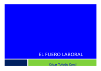 EL FUERO LABORAL César Toledo Corsi Concepto de fuero laboral 2 Es una especial forma de protección que establece la ley para ciertos trabajadores y trabajadoras que se encuentran en un especial estado de vulnerabilidad y que consiste fundamentalmente en que aquéllos no podrán ser despedidos, sino previa autorización judicial por alguna de las causales que dispone la ley. César Toledo Corsi- Profesor de Derecho del Trabajo 3 I.- El fuero sindical César Toledo Corsi- Profesor de Derecho del Trabajo I.- El fuero sindical. ¿A quiénes se les aplica? 4 1.- Directores de las organizaciones sindicales (sindicatos de base, así como de federaciones, confederaciones y centrales sindicales); 2.- Quienes concurren a la formación de un sindicato (de empresa, de establecimiento de empresa, interempresas y transitorios o eventuales) 3.- Candidatos a directores sindicales de un sindicato (de empresa, de establecimiento de empresa, interempresas y transitorios o eventuales); 4.- Delegados sindicales; (de sindicatos interempresas y transitorios o eventuales) 5.- Quienes participan (por la parte trabajadora) en una negociación colectiva reglada; César Toledo Corsi- Profesor de Derecho del Trabajo I.1.- Directores de las organizaciones sindicales 5 Extensión del fuero: Desde la fecha de su elección y hasta seis meses después de cesado en el cargo; Excepción: No subsiste el fuero si han cesado en su cargo por censura de la asamblea sindical, por sanciones aprobadas por el tribunal competente en cuya virtud debe hacerse abandono del mismo y por término de la empresa; César Toledo Corsi- Profesor de Derecho del Trabajo I.1.- Directores de las organizaciones sindicales 6 Número de directores aforados: 1) Sindicatos que afilien a menos de 25 trabajadores: 1 Director 2) Sindicatos que afilien entre 25 y 249 trabajadores: 3 Directores 3) Sindicatos que afilien entre 250 y 999 trabajadores: 5 Directores 4) Sindicatos que afilien entre 1000 y 2999 trabajadores: 7 Directores 5) Sindicatos que afilien entre 3000 o más trabajadores: 9 Directores En el caso de los sindicatos de empresa con 9 directores aforados que tengan presencia en dos o más Regiones, el número de directores aforados se aumentará en dos. César Toledo Corsi- Profesor de Derecho del Trabajo I.1.- Directores de las organizaciones sindicales 7 Extensión del fuero: Goza también del fuero suplementario de 6 meses (inciso 1° art.243 CT) el dirigente de un sindicato cuya personalidad jurídica caduca por no haberse subsanado dentro del plazo de 60 días el requisito del quorum que señala la ley para su constitución. (Dictamen DT N°3.483/0139, de 26.06.1996) César Toledo Corsi- Profesor de Derecho del Trabajo I.1.- Directores de las organizaciones sindicales 8 Los dirigentes sindicales de un sindicato de trabajadores independientes no gozan de fuero laboral, sin perjuicio del amparo que las normas legales sobre prohibición de prácticas antisindicales puedan brindarles para el ejercicio de sus funciones propias. (Dictamen DT Nº 7475/384 de 03/12/1997) Controversia a partir de jurisprudencia actual de la E. Corte Suprema César Toledo Corsi- Profesor de Derecho del Trabajo I.1.- Directores de las organizaciones sindicales 9 La pérdida de una de las mayorías relativas, de aquellas que otorgan fuero, en la reelección de directores, no es inconveniente jurídico para que el dirigente acceda al fuero suplementario de seis meses establecido en el artículo 243, inciso 1º del Código del Trabajo (Dictamen DT Nº 4777/221, de 14.12.2001) La composición de la directiva sindical que goza de las prerrogativas señaladas en los artículos 243, fuero sindical, 249, 250 y 251, permisos y licencias, todos del Código del Trabajo, se determina a la fecha de su elección y en función del número de afiliados que a esa data tenía la organización, careciendo de incidencia por tal efecto la circunstancia de que con posterioridad se produzca una disminución o aumento de los respectivos socios. (Dictamen DT Nº 4777/221, de 14.12.2001) César Toledo Corsi- Profesor de Derecho del Trabajo I. 2.- Quienes concurren a la formación de un sindicato 10 Extensión del fuero: Sindicatos de empresa, de establecimiento de empresa e interempresa: Desde los 10 días anteriores a la celebración de la respectiva Asamblea y hasta 30 días después de realizada, sin que pueda exceder de 40 días en total; Extensión del fuero: Sindicatos de trabajadores transitorios o eventuales: Desde los 10 días anteriores a la celebración de la respectiva Asamblea y hasta el día siguiente de la Asamblea constitutiva y sólo durante la vigencia del respectivo contrato de trabajo; Limitación de este fuero: Sólo puede invocarse dos veces en cada año calendario. César Toledo Corsi- Profesor de Derecho del Trabajo I. 2.- Quienes concurren a la formación de un sindicato 11 Extensión del fuero: Sindicatos de empresa, de establecimiento de empresa e interempresa: Desde los 10 días anteriores a la celebración de la respectiva Asamblea y hasta 30 días después de realizada, sin que pueda exceder de 40 días en total; Extensión del fuero: Sindicatos de trabajadores transitorios o eventuales: Desde los 10 días anteriores a la celebración de la respectiva Asamblea y hasta el día siguiente de la Asamblea constitutiva y sólo durante la vigencia del respectivo contrato de trabajo; Limitación de este fuero: Sólo puede invocarse dos veces en cada año calendario. César Toledo Corsi- Profesor de Derecho del Trabajo I. 2.- Quienes concurren a la formación de un sindicato 12 Este fuero, cuando la constitución del sindicato se materializa en sistema de votaciones parciales, comienza a correr desde 10 días antes del día en que los constituyentes llevan a efecto el primer acto de votación dirigido a constituir el sindicato, y hasta 30 días después de realizado el último acto de votación destinado a constituir la organización respectiva, con un tope máximo de 4