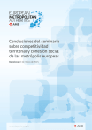 Conclusiones del seminario sobre competitividad territorial y cohesión social de las metrópolis europeas Barcelona 13 de marzo de 2015 www.amb.cat/ambmetropole European Metropolitan Authorities 2015, Conferencia de representantes políticos de ciudades y gobiernos metropolitanos europeos para afrontar los retos de futuro comunes para construir una Europa competitiva y socialmente inclusiva. Més informació a: www.amb.cat/ambmetropole Índice: 1. Presentación. . . . . . . . . . . . . . . . . . . . . . . . . . . . . . . . . . . . . . . . . . . . . . . . . . . . . . . . . . . . . . . . . . . . 3 2. Declaración European Metropolitan Authorities 2015. . . . . . . . . . . . . . . . . . . . . . . . . . . . . . . 4 3. Relato ejecutivo de la conferencia: . . . . . . . . . . . . . . . . . . . . . . . . . . . . . . . . . . . . . . . . . . . . . . . . . 6 4. Documento Marco: . . . . . . . . . . . . . . . . . . . . . . . . . . . . . . . . . . . . . . . . . . . . . . . . . . . . . . . . . . . . . . 18 La gobernanza metropolitana en Europa: Modelos y retos. 5. Galería de imagenes. . . . . . . . . . . . . . . . . . . . . . . . . . . . . . . . . . . . . . . . . . . . . . . . . . . . . . . . . . . . . 32 Competitividad territorial y cohesión social 3 1. Presentación Tengo el placer de adjuntarles los resultados del seminario European Metropolitan Authorites (EMA) que tuvo lugar en Barcelona el pasado 13 de marzo, organizado por el Área Metropolitana de Barcelona, y que contó con la participación de alcaldes, presidentes y representantes políticos de quince metrópolis de diez países de la Unión Europea. Esta jornada tenía el objetivo de debatir sobre los retos de futuro de la gobernanza de las metrópolis europeas y definir las bases de una relación de partenariado entre ellas, a partir de un manifiesto político que adoptamos los participantes y que encontraran en esta publicación, para poder ser más influyentes frente a los estados y la Unión Europa. Cabe decir que el desarrollo urbano es un fenómeno de referencia necesario para explicar la primera década del siglo XXI. Y aún más para las autoridades locales, considerando que en el contexto europeo, alrededor de 359 millones de personas - el 72% de la población total de la UE - viven en grandes ciudades y áreas metropolitanas y se prevé que en el 2050 esta cifra supere el 80%. Así mismo, las metrópolis contemporáneas se han convertido en entidades complejas, autónomas y diversas, donde se manifiestan la totalidad de las necesidades e intereses de la ciudadanía. En las grandes ciudades y áreas metropolitanas se están produciendo los mayores índices nacionales de crecimiento económico, innovación y generación de ocupación en un entorno generalizado de crisis y austeridad de las finanzas públicas. Según la oficina europea de estadística Eurostat, el 85% del PIB Europeo se concentra en las ciudades. Actualmente en Europa hay alrededor de 120 grandes ciudades y áreas metropolitanas. Países como Francia e Italia han iniciado procesos de creación de nuevas áreas metropolitanas que incidirán en su gobernanza institucional y territorial. Las grandes ciudades y áreas metropolitanas europeas deben tejer alianzas y defender activamente sus intereses haciendo propuestas a la Unión Europea en ámbitos tales como el proyecto de la nueva Agenda Urbana Europea o la implementación de los Fondos Europeos 2014-2020. Existe una gobernanza metropolitana realmente condicionada por las continuas demandas que se imponen sobre las agendas políticas locales, casi nunca de una forma administrativamente planificada, ni tampoco económicamente prevista. La dificultad de afrontar la gobernabilidad metropolitana del siglo XXI se acentúa con la globalización. Pero la realidad es que sus impactos se reciben de formas muy diversas, y hasta diferentes, según cuál sea el ámbito urbano, socioeconómico y cultural de recepción. Así pues, no es lo mismo ni representan los mismos desafíos de gobernabilidad, una mega-ciudad asiática o latinoamericana, una ciudad-global europea o norteamericana, o una ciudad-metropolitana que es el referente de un ámbito regional. En todos los casos, podemos hablar de amenazas y oportunidades respecto a servicios públicos básicos, exclusión social, vivienda protegida, seguridad o sostenibilidad económica, social y medioambiental. Es una nueva agenda que procede de las urgencias de proximidad de los ciudadanos, que son diversas según las propias características de cada realidad metropolitana, pero que siempre se trasladan sobre las autoridades más próximas, sin que éstas dispongan ni de los recursos, ni de los marcos regulatorios adecuados para darles respuesta. El Área Metropolitana de Barcelona (AMB) en este momento particular de cierre de su primer mandato 2011-2015, después de su creación en el año 2010, quiso compartir y debatir con los representantes de las ciudades y metrópolis europeas de dimensiones y realidades urbanas o equivalentes, metodologías, iniciativas, experiencias y proyectos de innovación aplicados en el ámbito metropolitano. Deseo que los contenidos y retos sobre el futuro de las áreas metropolitanas europeas que se exponen en esta publicación sean de su interés. Xavier Trias Alcalde y Presidente del Área Metropolitana de Barcelona. 2. DECLARACIÓN DEL SEMINARIO: EUROPEAN METROPOLITAN AUTHORITIES Los alcaldes, alcaldesas, presidentes, presidentas y los representantes políticos de las metrópolis europeas nos hemos reunido en Barcelona para debatir sobre los retos y oportunidades creadas al afrontar la gobernanza de las ciudades metropolitanas europeas. Considerando que en Europa más de 70% de la población vive en áreas urbanas y que estos territorios son los que generan los más altos índices de riqueza, competitividad, ocupación, innovación y educación, entendemos que la fortaleza y la calidad de las estructuras de gobernanza metropolitana son determina