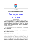 Texto elaborado por: Equipo AMEI PLAN DE ACTIVIDADES DE 12 A 15 MESES programa de estimulación para niños y niñas de 0 a 3 años INTRODUCCIÓN A los 15 meses el niño o niña parece perder toda su armonía y equilibrio, es el momento en el que el niño o niña deja de arrastrarse y gatear para empezar a dar sus primeros pasos. Su impulso motor es muy poderoso. Se encuentra en incesante actividad, poniéndose en marcha, deteniéndose, volviendo a marchar, trepando y encaramándose. Constantemente está lanzando los objetos en pro de comprobar dónde cae con su lanzamiento, siguiendo el recorrido con la mirada, ejercicio muy importante para la acomodación de la mirada y convergencia ocular ya que requiere una ágil coordinación de los diferentes músculos oculares. Lo que caracteriza este período es la exploración activa e intencionada de las características estructurales y funcionales de los objetos, por medio de nuevas y diversas formas de actuar sobre ellos. El niño o niña intensifica su aproximación al mundo exterior explorando y descubriendo medios nuevos para alcanzar sus metas, como por ejemplo, coger un objeto tirando de la tela que está debajo de él. Aprende por ensayo-error. Ensaya distintas pautas de conducta buscando la forma más efectiva de alcanzar un objetivo. En cuanto al lenguaje, paulatina y progresivamente el bebé pasa de las emisiones fonemáticas aisladas y sus gestos, a la palabra. Será alrededor de los 12 meses cuando aparecen las primeras palabras aunque éstas no sean el primer signo de expresión, ni se pueda precisar con exactitud el momento en el que el niño o niña ejecuta esta hazaña. Utiliza la “jerga”. Acompaña su habla con gestos y ademanes. Comprende y responde a instrucciones sencillas. Su vocabulario consta de 5 a 20 palabras y utiliza frases de una sola palabra. Las primeras palabras infantiles son gramaticalmente hablando sustantivos y tienen todo el valor de una frase. Son palabras que, expresadas de una forma más o menos correcta imitan al adulto. La imitación se sitúa así en la base de todo aprendizaje lingüístico, en donde el niño seleccionará los vocablos según su dificultad de articulación y en función de su facilidad de comprensión. A pesar de todo esto el niño o niña de 15 meses no es todo ruido y tumulto, es capaz de construir una torre de dos cubos con bastante agilidad, esto constituye un hecho constructivo muy importante. Puede introducir una bolita u objeto pequeño dentro de su recipiente sin previa demostración ni instrucción. Esta conducta espontánea es una clave en su aptitud evolutiva. objetivos propuestos ÁREA : IDENTIDAD Y AUTONOMÍA PERSONAL ámbito 1 (12.15) 1.- Caminar solo. 2.- Reconocer partes del cuerpo. 3.- Ponerse de pie sin ayuda. 4.- Comer solo con cuchara derramando un poco. 5.- Subir escaleras gateando. 6.- Intentar quitarse los calcetines y el gorro. 7.- Comenzar a avisar cuando esté sucio. 8.- Beber solo en taza o vaso. ÁREA : MEDIO FÍSICO Y SOCIAL ámbito 2 (12.15) 1.- Explorar los objetos en períodos cortos de tiempo 2.- Ojear libros ilustrados 3.- Manipular con agua, arena o tierra 4.- Observar y acariciar los animales domésticos 5.- Mostrar interés por los elementos de la calle 6.- Imitar actividades de la vida doméstica (limpiar el polvo, lavar, etc. 7.- Buscar juguetes escondidos en lugares nuevos 8.- Comenzar a interrelacionarse con otros niños 1 ÁREA : COMUNICACIÓN Y REPRESENTACIÓN ámbito 3 (12.15) 1.- Realizar garabatos 2.- Soplar veletas encendidas, bolitas de algodón, etc. 3.- Realizar gestos para pedir las cosas 4.- Intentar repetir las palabras que le nombremos 5.- Acompañar la música golpeando objetos a un ritmo 6.- Emitir sonidos para pedir objetos 7.- Encajar el círculo en el tablero 8.- Imitar acciones 9.- Hacer torres de dos cubos 10.- Meter objetos dentro de un recipiente 11.- Obedecer pequeñas órdenes 12.- Desplazar objetos tirados por una cuerda CUADRO DE COMPROBACIÓN OBJETIVOS-ACTIVIDADES-DIMENSIONES MADURATIVAS dimensión madurativa: sensorial DIMENSIÓN MADURATIVA SENSORIAL OBJETIVOS del ámbito 1 del ámbito 2 del ámbito 3 1 2 3 4 5 6 7 8 1 2 3 4 5 6 7 8 1 2 3 4 5 6 7 8 9 0 1 2 P.D.M. visual P.D.M. auditiva P.D.M. táctil P.D.M. olfativa P.D.M. gustativa dimensión madurativa: salud DIMENSIÓN MADURATIVA SALUD OBJETIVOS del ámbito 1 del ámbito 2 del ámbito 3 1 2 3 4 5 6 7 8 1 2 3 4 5 6 7 8 1 2 3 4 5 6 7 8 9 0 1 2 Habit. Higiene personal Higiene de la nutrición Prevención accidentes Prevenc. enfermedades Salud mental Educación vial Educación ambiental 2 dimensión madurativa: psicomotriz DIMENSIÓN MADURATIVA PSICOMOTRIZ OBJETIVOS del ámbito 1 del ámbito 2 del ámbito 3 1 2 3 4 5 6 7 8 1 2 3 4 5 6 7 8 1 2 3 4 5 6 7 8 9 0 1 2 Esquema corporal Organización espacial Organización temporal dimensión madurativa: cognitivo DIMENSIÓN MADURATIVA COGNITIVO OBJETIVOS del ámbito 1 del ámbito 2 del ámbito 3 1 2 3 4 5 6 7 8 1 2 3 4 5 6 7 8 1 2 3 4 5 6 7 8 9 0 1 2 Asociación Clasificación Seriación Relaciones Semejanzas y diferencias Pertenencias Codificación Resolución problemas Imaginación Relacón. causa-efecto Observación Experimentación dimensión madurativa: comunicativa DIMENSIÓN MADURATIVA COMUNICATIVA OBJETIVOS del ámbito 1 del ámbito 2 del ámbito 3 1 2 3 4 5 6 7 8 1 2 3 4 5 6 7 8 1 2 3 4 5 6 7 8 9 0 1 2 Lenguaje oral Iniciac. Lengua escrita Expresión plástica Expresión corporal Expresión musical dimensión madurativa: creativa DIMENSIÓN MADURATIVA CREATIVA OBJETIVOS del ámbito 1 del ámbito 2 del ámbito 3 1 2 3 4 5 6 7 8 1 2 3 4 5 6 7 8 1 2 3 4 5 6 7 8 9 0 1 2 Expresividad personal Capac. imag.intuitiva 3 Respue-actitud creativa Expres. viven-sentimient. Sensibilidad estética dimensión madurativa: social DIMENSIÓN MADURATIVA SOCIAL OBJETIVOS del ámbito 1 del ámbito 2 del ámbito 3 1 2 3 4 5 6 7 8 1 2 3 4 5 6 7 8 1 2 3 4 5 6 7 8 9 0 1 2 Integrac.grupos sociales Colaboración Comprensión Respeto Interi