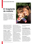 CÉLULAS QUE DAN VIDA El trasplante de médula © Para muchos enfermos, este trasplante es la única esperanza de salvación. Las especiales características de unas células abundantes en la médula, las células madre o progenitores hematopoyéticos, dan razón de esa importancia. Trasplante, células madre, médula ósea... seguro que en más de una ocasión ha oído hablar de esto. Lo cierto es que el trasplante hematopoyético, mal llamado “de médula”, es la única posibilidad de curación para muchos enfermos. Pero, ¿qué tiene la médula de especial? Células... ¿qué? En la médula ósea, un tejido esponjoso que rellena las cavidades de los huesos, se originan los progenitores hematopoyéticos, un tipo de células madre que genera todas las células de la sangre: los glóbulos blancos (leucocitos), que permiten combatir las infecciones; los glóbulos rojos (hematíes), que transportan el oxígeno a los tejidos, llevando de vuelta el dióxido de carbono, y las plaquetas, que permiten la coagulación de la sangre. Las células madre son células que están en un estadio previo a la diferenciación que sufren las células para formar los 34 OCU-SALUD Nº 57 DICIEMBRE 2004-ENERO 2005 distintos órganos o tejidos. Estas células originales están en la génesis de todas las demás, y cada una de ellas tienen la capacidad de generar, en principio de forma ilimitada, células idénticas a ella (de ahí el término progenitores), que a su vez son capaces de evolucionar y generar otras células. Actúan así como un comodín en nuestro organismo, sustituyendo a células que, por cualquier motivo, estan enfermas o han desaparecido. Las células madre o progenitores hematopoyéticos pueden restaurar la producción sanguínea en caso de determinadas enfermedades, o generar una médula nueva en pacientes aquejados de leucemias, linfomas, y otras enfermedades de la sangre. Y gracias a ellas pacientes enfermos de cáncer pueden someterse a agresivos tratamientos con quimio o radioterapia. En la médula ósea radica la mayor concentración de células hematopoyéticas, pero también en la sangre hay células de este tipo. Otra buena fuente de células madre es el cordón umbilical. Una médula nueva Lo que llamamos trasplante de médula consiste en realidad en introducir células hematopoyéticas sanas (que, como hemos visto, no sólo pueden obtenerse de la médula) en un paciente que, por alguna enfermedad o tratamiento, se ha quedado sin ellas. Esas nuevas células madre en su organismo serán capaces de regenerar la médula ósea, que a su vez generará nuevas células sanas. Tipos de trasplante Hay distintos tipos de trasplante, por ejemplo, según la fuente de la que se hayan obtenido las células madre, pero la principal clasificación se establece en función del donante de esas células. Así, las células pueden proceder del propio paciente o de un donante externo. El trasplante autólogo es aquél en que las células que se infunden en el organismo enfermo provienen del mismo paciente. Se obtienen sus células cuando el organismo ha respondido a la enfermedad, y se congelan para ser utilizadas cuando sea preciso. Este tipo de trasplante en principio entraña menos complicaciones, pero no siempre es tan eficaz en las curaciones. El trasplante alogénico es aquél en el que las células madre proceden de un donante compatible, ya sea un familiar (casi siempre un hermano) o un donante voluntario no emparentado, localizado a través de un registro. ¿Cómo se obtienen las células? Ya sabemos que las células madre o hematopoyéticas que se usan en el trasplante pueden provenir de distintas fuentes, y según su origen se usan distintos sistemas para obtenerlas. De la médula ósea se obtienen progenitores hematopoyéticos por aspiración, tras practicar varias punciones en un hueso de la cadera del donante. También pueden obtenerse de la sangre periférica. Aunque normalmente circulan pocos progenitores hematopoyéticos en la sangre, es posible movilizar grandes cantidades de estas células desde la médula usando factores de crecimiento, que estimulan su salida a la sangre periférica. Después se realiza una aféresis: la sangre circula hacia una máquina que separa las células madre del resto de los elementos, que vuelven al organismo del paciente. La sangre del cordón umbilical contiene una significativa cantidad de células madre que se pueden usar para trasplante: después del parto es posible recoger la sangre que queda en cordón y placenta. Estas células se pueden congelar y luego ser usadas para un trasplante (aunque el volumen es pequeño y no siempre bastan para un receptor adulto). El procedimiento Sea del tipo que sea, un trasplante hematopoyético es siempre un proceso complejo (aunque con apenas riesgo quirúrgico si se compara con los trasplantes de órganos). En cualquier caso, pasa por varias etapas. De entrada, deben hacerse unos estudios previos para ver si el enfermo es candidato a un programa de ¿QUÉ ENFERMEDADES PUEDEN REQUERIR UN TRASPLANTE? Cuando hablamos de trasplante de médula, la primera enfermedad que nos viene a la cabeza es la leucemia. Efectivamente, el trasplante de progenitores hematopoyéticos es especialmente indicado para tratar las neoplasias de la sangre, las leucemias, tanto mieloides como linfoides. Este tipo de cáncer, que afecta a las células de defensa de la sangre, tiene una elevada incidencia también en niños, en particular en las formas más agudas, aquéllas que, por su rápida evolución y grave pronóstico requieren un tratamiento inmediato. Los resultados de los trasplantes en estos casos son ciertamente espectaculares. Pero, además de la leucemia, hay un buen número de enfermedades que pueden llegar a curarse gracias a un trasplante hematopoyético: • Otras enfermedades de la sangre como la talasemia mayor. • Enfermedades de la médula, como la aplasia medular, (un proceso en el que la médula ósea deja de funci