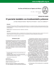 www.medigraphic.org.mx Archivos de Medicina de Urgencia de México Vol. 5, Núm. 1 - Enero-Abril 2013 pp 25-37 Artículo de revisión El paciente inestable con tromboembolia pulmonar José Isaac Velázquez Alcántara,* Miguel Russi Hernández,** Jorge Loria Castellanos*** RESUMEN El tromboembolismo pulmonar (TEP) es una entidad cardiopulmonar con una incidencia creciente y elevadas repercusiones clínicas, económicas y sociales. Un adecuado abordaje diagnóstico y terapéutico nos ofrecerá la oportunidad de atender de forma adecuada a estos pacientes. Palabras clave: Tromboembolia pulmonar, diagnóstico, tratamiento. ABSTRACT Pulmonary thromboembolism (PTE) is a cardiopulmonary increasing incidence and high impact clinical, economic and social. An adequate diagnostic and therapeutic approach will give us the opportunity to respond adequately to these patients. Key words: Pulmonary embolism, diagnosis, treatment. INTRODUCCIÓN El tromboembolismo pulmonar (TEP) es una enfermedad cardiovascular y cardiopulmonar con una incidencia que excede 1 en 1,000 y una tasa de mortalidad que excede el 15% en los primeros tres meses después del diagnóstico.1-5 El colapso hemodinámico posterior a un embolismo masivo puede ser uno de los encuentros que provocan mayor ansiedad en toda la carrera del médico de emergencia. * Urgenciólogo, Residente de Medicina Crítica Hospital Ángeles, Clínica Londres, UNAM. ** Urgenciólogo, Jefe del Servicio Admisión Continua Adultos UMAE, Hospital General CMN «La Raza». *** Titular de la Especialidad de Urgencias, HGR 25. El embolismo pulmonar masivo se caracteriza por inestabilidad hemodinámica abrupta causada por disfunción aguda del ventrículo derecho (VD), el cual es secundario a vasoconstricción y obstrucción arterial pulmonar, incrementa las resistencias vasculares pulmonares y postcarga del ventrículo derecho.6 El diagnóstico en el Servicio de Urgencias, así como el manejo del embolismo pulmonar puede ser desafiante. Las diferentes formas de presentación de la TEP comparten características clínicas con otras patologías comunes que se atienden en el Servicio de Urgencias (infarto del miocardio, sepsis y falla cardiaca). El TEP puede progresar y causar disfunción moderada o severa del VD, con disminución en el gasto cardiaco (GC), y eventualmente arresto cardiaco, lo que conlleva una mortalidad elevada.7 Por lo tanto, un diagnóstico correcto y su distinción entre TEP masivo y TEP submasivo, son pasos importantes del algoritmo de manejo.7 Goldhaber describió seis síndromes en el tromboembolismo pulmonar. Los primeros dos, TEP masiva y TEP submasiva, implican defectos significativos en la perfusión pulmonar, así como disfunción del ventrículo derecho.6 www.medigraphic.org.mx Instituto Mexicano del Seguro Social. Correspondencia: Miguel Russi Hernández E-mail: [email protected] Recibido para publicación: 31 de agosto de 2012. Aceptado: 12 de diciembre de 2012. Este artículo puede ser consultado en versión completa en http://www.medigraphic.com/archivosdemedicinadeurgencia 1. TEP submasivo: 30% de obstrucción en la perfusión pulmonar. Archivos de Medicina de Urgencia de México 2013;5 (1): 25-37 26 2. TEP masivo: > 50% de obstrucción en la perfusión pulmonar. Estos dos síndromes pueden ser diferenciados uno de otro por una transición de la presión sistémica relativamente normal a la presencia de hipotensión arterial sistémica persistente. El TEP masivo se puede distinguir del TEP submasivo por la presencia de inestabilidad hemodinámica; esta distinción forma parte de toda una estrategia en la estratificación de riesgo y manejo.8 El uso de biomarcadores combinados con la medición del VD por tomografía computada y ecocardiografía ayudan no sólo a diferenciar los estados de shock, sino que también auxilian en la estratificación de riesgo y gravedad del paciente. Los pacientes con TEP masivo, inestabilidad hemodinámica, y/o choque cardiogénico (identificado por una presión arterial sistólica [PAS] < 90 mmHg sin otra explicación) tienen una tasa de mortalidad elevada, y se ven beneficiados por tratamiento inmediato (tratamiento tiempo-dependiente).1,6,9-16 Mucha de la literatura de urgencias se enfoca en el diagnóstico diferencial y estratificación del riesgo de tromboembolismo pulmonar mediante el empleo de varios algoritmos. Sorprendentemente, existe aún poca información que soporte el uso de un algoritmo exclusivo y único para reanimar al paciente inestable con TEP. A pesar de que para el manejo óptimo del tromboembolismo pulmonar (TEP) masivo se requiere de un equipo multidisciplinario, es de suma importancia que el médico de urgencias conozca perfectamente el manejo agudo de estos pacientes, puesto que la mayoría de las muertes ocurren en la 1ª o 2ª hora durante el manejo.17 El manejo óptimo debe incluir la rápida diferenciación de TEP masivo del submasivo, implementación de reanimación basada en evidencia, y el inicio temprano de terapia trombolítica y de anticoagulación pertinente (Figura 1): • La presencia de shock y tromboembolismo pulmonar masivo, es una indicación clara para la trombólisis. Para muchos médicos, la presencia de hipotensión en el escenario de TEP agudo indica inestabilidad hemodinámica, y es clara indicación para terapia trombolítica. • En los pacientes inestables, se deberán administrar líquidos IV e iniciarse terapia vasopresora cuando esté indicado. • Dilatación y disfunción severa del ventrículo derecho predicen un peor pronóstico, y ayudan a identificar a los pacientes que se pueden ver beneficiados por la reanimación y la trombólisis. A pesar de la presencia de biomarcadores positivos, se deben considerar en conjunto con otros criterios. Estos exámenes, por sí solos, no han permitido estratificar a los grupos que se ven beneficiados de la terapia trombolítica. • En los pacientes extremadamente inestables, la trombólisis no debe retrasarse