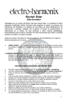 Ravish Sitar Sitar Emulator Felicidades por su compra del Electro Harmonix Ravish Sitar, un emulador de citara altamente modificable. Electro Harmonix está orgulloso en traerle un producto que transforma con precisión a su guitarra en una cítara, sin hacer alteraciones a su instrumento o necesitar cualquier otro accesorio. El Ravish es prácticamente un instrumento en si mismo. Es muy profundo y tiene muchas posibilidades. Recomendamos que se tome un tiempo con este manual para que usted y el Ravish puedan ser traídos a un plano más alto. Antes de proceder más allá en el manual, puede ser útil el familiarizarse con algunos términos asociados con la cítara: • LíDER (LEAD) – Las cuerdas principales tocadas en la cítara. Estas cuerdas pueden ser pulsadas y dobladas a la voluntad del ejecutante de la misma manera que las de una guitarra. • CUERDAS SIMPÁTICAS – Hay de 11 a 17 cuerdas simpáticas en el cuerpo de una cítara que resuenan en todo momento. No pueden ser pulsadas. Estas cuerdas están afinadas a la tonalidad y escala determinada por el ejecutante. El tocar notas más graves provocará que las los tonos más graves resuenen y el tocar notas más altas provocará similarmente que los tonos más altos resuenen. Características Especiales del Ravish Sitar • • • • • • • • • • • • - Controles independientes de timbre para los tonos de cuerdas líder y simpáticas. Controles independientes de volumen para las voces dry, líder y cuerdas simpáticas. I Toque en todas las doce tonalidades cromáticas en escalas mayores, menores y exóticas. Cree sus propias escalas simpáticas a medida, hasta 17 notas incluyendo microtonos. Congelar las cuerdas simpáticas manteniendo presionado el footswitch de PRESET. Desvanezca y congele cuerdas simpáticas con un pedal de expresión opcional. Controle el decaimiento de las notas líderes de la cítara. Module kas notas simpáticas para crear movimiento similar al de una tanpura. Haga un Bend de la frecuencia de la voz líder desde un semitono hasta una octava utilizando un pedal de expresión opcional. Separe las salidas para la mezcla principal y las cuerdas simpáticas. Control de Q seleccionable en la voz líder permite variación de orgánica a sintética. 10 presets totalmente programables o déjelo en la modalidad de What You See Is What You Get (WYSIWYG) ( Lo que ve es lo que obtiene). 1 ADVERTENCIA: Su Ravish Sitar viene equipado con una fuente de poder (adaptador) Electro-Harmonix 9.6DC200 (el mismo utilizado por Boss® e Ibanez®: 9.6 Volts DC 200mA / Centro Negativo). El Ravish Sitar requiere 160mA a 9VDC con un plug de centro negativo. El Ravish no utiliza pilas. El utilizar el adaptador incorrecto puede dañar su aparato e invalidar la garantía. Guía Para un Comienzo Rápido – Esta Guía Para un Comienzo Rápido le ayudará a comenzar a usar su Ravish Sitar inmediatamente. Para información detallada de todas la características y funciones del Ravish Sitar, por favor vea el resto del manual. — Setup-Conexiones 1. Utilizando un cable desbalanceado de instrumento, conecte la salida de su instrumento en el jack de INPUT (Entrada) en el lado derecho del Ravish. Conecte un cable desbalanceado de instrumento del jack de MAIN OUT (Salida Principal) al jack de entrada de un amplificador. 2. Conecte el Adaptador AC incluido a una toma de corriente y conecte su conector de barrila en el jack de corriente de 9V en la parte superior del Ravish. 3. Prenda el amplificador y suba el volumen de su instrumento. Presione el interruptor de pie (footswitch) para que quede encendido el LED de STATUS; el Ravish ahora está activado. A. Posiciones (Settings)de Preset (Preprogramado) Presione y suelte el interrptor de pie de PRESET para hacer un ciclo a través de los settings de los presets del Ravish. Cada preset de fábrica ha sido preparado con cuidado para utilizar las profundas capacidades sónicas del Ravish. Usted puede sobreescribir los presets de fábrica con sus propias creaciones sónicas cuando lo desee. B. Settings Manuales 1. Para comenzar, gire las perillas del Ravish a las siguientes posiciones: DRY LEVEL: LEAD LEVEL: SYMPATHETIC LEVEL: LEAD TIMBRE: SYMPATHETIC TIMBRE: 2:00 12:00 12:00 3:00 11:00 2. Asegúrese de que el LED de PRESET verde (debajo del visualizador de segmento) esté apagado. Si está encendido, gire la perilla blanca de MODE/PRESET en el sentido de las manecillas del reloj hasta que el LED de PRESET se apague. Esta acción desactiva al preset actualmente cargado. 3. Presione y suelte la perilla de MODE/PRESET para hacer un ciclo en la modalidad de KEY (tonalidad). Esto está denotado por el encendido del LED de KEY a si como también un punto en la esquina inferior derecha del visualizador de segmento derecho. Gire la perilla de MODE/PRESET hasta que E MAJOR (Mi Mayor o cualquier tonalidad que desee) sea seleccionada. 4. Presione la perilla de MODE/PRESET para hacer un ciclo al control de DECAY. Esto está denotado por el encendido de DCY LED. El segmento derecho (del visualizador) mostrara un numero entre 0 y 9. Seleccione 3 para un decay (decaimiento) corto asemejando al de una cítara real. 5. Presione la parilla de MODE/PRESET para hacer un ciclo al control de MODULATION. Seleccione un valor entre 1 y 3 para una modulación bonita y lenta 2 ó 0 para que no haya modulación. — FUNCIONES DE LAS PERILLAS — DRY LEVEL – Controla el volumen para la señal dry (seca, directa, sin efecto, la señal original de su instrumento) presente en el MAIN OUTPUT (Salida Principal). En la posición máxima en el sentido opuesto de las manecillas del reloj, no hay señal seca en la salida. En su posición máxima en el sentido de las manecillas del reloj, la señal seca está en su máximo, que es 2dB arriba de la ganancia unitaria. LEAD LEVEL – Controla la cantidad de señal líder de la cítara presente en el MAIN OUTPUT. En la posición máxima en el sentido opuesto de las manecill