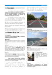 TEMA 1. LA VÍA 1.1. Concepto La vía pública es el espacio por el que se desplazan los conductores, peatones y animales. Para que estos desplazamientos se puedan realizar con la máxima seguridad, es necesaria la colaboración entre todos los usuarios. ciclomotores deberán circular por el el arcén si este fuera transitable. En su defecto, circularán ciñéndose al borde derecho de la calzada. Los preceptos de la Ley sobre tráfico, circulación de vehículos a motor y seguridad vial serán aplicables a los titulares y usuarios de: ► Vías y terrenos públicos aptos para la circulación, tanto urbanos como interurbanos. ► Vías y terrenos que, sin tener tal aptitud, sean de uso común. ► Vías y terrenos privados que sean utilizados por una colectividad indeterminada de usuarios. 1.2. Partes de la vía ► Mediana: Franja longitudinal de terreno situada entre dos plataformas. No destinada a circulación. ► Plataforma: Zona de la carretera dedicada al uso de vehículos, formada por calzada y arcenes. ► Calzada: Parte central de la vía dispuesta para la circulación de vehículos. Se compone de un cierto número de carriles. ► Carril: Banda longitudinal en que puede estar subdividida la calzada, delimitada o no por marcas viales longitudinales, siempre que tenga un anchura suficiente para permitir la circulación de una fila de automóviles que no sean motocicletas. ► Arcén: Franja longitudinal afirmada contigua a la calzada, no destinada al uso de vehículos automóviles, más que en circunstancias excepcionales. Como norma general está prohibido circular por el arcén. También está prohibido parar o estacionar en su parte transitable. Como excepción, los vehículos de menos de 3500 kg deberán circular por el arcén cuando por emergencia no alcancen la velocidad mínima permitida. En vías fuera de poblado, los ► Acera: Zona longitudinal de la carretera, elevada o no, destinada al tránsito de peatones. ► Zona peatonal: Parte de la vía, elevada o delimitada, reservada a la circulación de peatones. Incluye la acera, el paseo y el andén. ► Isleta: Zona elevada o delimitada de la calzada, normalmente en las intersecciones, cuya finalidad es canalizar el tráfico. TEMA 1. LA VÍA ► Refugio: Zona peatonal situada en la calzada y protegida del tráfico rodado. isleta central, por lo que el tráfico pasa de uno a otro y no la rodea. Se circulará dejando a la izquierda la isleta central. ► Curva: Tramo en el que la vía cambia de dirección. En una glorieta fuera de poblado, cuando haya más de un carril, se circula por el de la derecha. No obstante, se podrá utilizar el resto de los carriles cuando las circunstancias del tráfico lo exijan. En ningún caso se podrá realizar la salida cortando la trayectoria de los vehículos que circulan por el carril exterior. ► Curva de visibilidad reducida: Curva desde la que no se ve toda la anchura de la calzada, los vehículos circulan en sentido contrario o no se es visto por los que circulan detrás. ► Rasante: Inclinación de un tramo de la vía. ► Cambio de rasante: Lugar en el que se encuentran dos tramos de la vía con distinta inclinación. Cuando impide la visibilidad de los vehículos que circulan por otra rasante, se le denomina cambio de rasante de visibilidad reducida. ► Apartadero: Ensanchamiento de la calzada destinado a la detención de vehículos sin interceptar la circulación. ► Glorieta: Es un tipo especial de intersección en la que los tramos que confluyen en ella se comunican a través de un anillo en el que se establece una circulación rotatoria alrededor de una isleta central. 1.3. Clasificación de vías 1.3.1 Dentro de poblado Poblado: Espacio que comprende edificios y en cuyas vías de entrada y de salida están colocadas, respectivamente, las señales de entrada a poblado y de salida de poblado. Pueden ser: ► Vía urbana: son todas la vías de una población, excepto las travesías. ► Travesía: tramo de carretera que discurre por poblado, salvo las que tengan una alternativa viaria o variante a la cual tiene acceso. 1.3.2. Fuera de poblado Las vías interurbanas son todas las vías situadas fuera de poblado. Se denomina carretera a toda vía pública pavimentada situada fuera de poblado, salvo los tramos en travesía. En las vías interurbanas se debe circular como regla general por el carril de más a la derecha. Los demás carriles únicamente se ocuparán para realizar los precisos adelantamientos o giros hacia la izquierda, y siempre sin entorpecer la marcha de los vehículos que le siguen. No son glorietas las denominadas glorietas partidas en la que dos tramos, generalmente opuestos, se conectan directamente a través de la En calzadas con doble sentido de circulación y tres carriles separados por marcas longitudinales discontinuas, el carril central tan sólo se utilizará para efectuar los adelantamientos precisos y para cambiar de dirección hacia la izquierda. TEMA 1. LA VÍA Fuera de poblado podemos encontrar las siguientes vías: derecho con las luces de emergencia encendidas y coger la primera salida que encuentre. ► Autopista y autovía En cambio, se prohíbe su utilización a: ► Ciclos y ciclomotores: los ciclistas mayores de 14 años podrán circular por los arcenes de las autovías, salvo que en la entrada se encuentres con la señal específica que lo prohíba. ► Vehículos personas de movilidad reducida. ► Peatones. ► Animales. La autopista es la carretera especialmente proyectada, construida y señalizada para la exclusiva circulación de automóviles, y reúne las siguientes características: ► Consta de distintas calzadas para cada sentido de circulación separadas, salvo en puntos muy singulares, por medianas u otros medios. ► No cruzan a nivel con ninguna otra senda, vía, línea de ferrocarril o tranvía. ► No tienen que acceso a ella las propiedades colindantes. La autovía es la carretera especialmente proyectada, construida y se