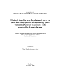 i ZAMORANO CARRERA DE CIENCIA Y PRODUCCIÓN AGROPECUARIA Efecto de dos alturas y dos edades de corte en pasto Estrella (Cynodon nlemfuensis) y pasto Tanzania (Panicum maximum) en la producción de materia seca Trabajo de graduación presentado como requisito parcial para optar al título de Ingeniero Agrónomo en el Grado Académico de Licenciatura. Presentado por Faisal Martín Aramayo Adad Honduras Diciembre, 2002 ii El autor concede a Zamorano permiso para reproducir y distribuir copias de este trabajo para fines educativos. Para otras personas físicas o jurídicas se reservan los derechos del autor. ______________________ Faisal Martín Aramayo Adad Honduras Diciembre, 2002 iii Efecto de dos alturas y dos edades de corte en pasto Estrella (Cynodon nlemfuensis) y pasto Tanzania (Panicum maximum) en la producción de materia seca Faisal Martín Aramayo Adad Aprobada ________________________ Miguel Vélez, Ph.D. Asesor Principal ________________________ Jorge Iván Restrepo, M.B.A Coordinador de Carrera de Ciencia y Producción Agropecuaria ________________________ John Jairo Hincapié, Ph.D. Asesor ________________________ Antonio Flores, Ph.D. Decano Académico ________________________ Miguel Vélez, Ph.D. Coordinador Área Temática ________________________ Mario Contreras, Ph.D. Director General iv DEDICATORIA A Dios todo poderoso. A mi madre Marlene y mi padre que en paz descansa Rodolfo por ser un ejemplo a seguir y enseñarme a luchar por lo que quiero. A mi hermano Juan Sebastián y mi tía Carmen Rosa por apoyarme incondicionalmente. A mi abuelo Faisal por hacer realidad mi sueño de estudiar en Zamorano. v AGRADECIMIENTOS A Dios, por darme fuerza y paciencia para sobrepasar todas las pruebas en mi camino y por darme la fuente de inspiración para todo mi trabajo: a mi familia. A mi madre y abuelo por darme la oportunidad de estudiar donde yo más quería. A mi tía Caisa por apoyarme en todo momento y forma posible. Al Dr. Vélez por su ejemplo y paciencia. Al Dr. Hincapié por su comprensión. A la Cambonia por todos los momentos buenos que pasamos en este periodo de nuestras vidas. A todo el personal de Zootecnia y en especial a Carlos por su ayuda y paciencia. A ZAMORANO por enseñarme que en la vida nada es fácil y que uno si quiere lo consigue. vi RESUMEN Aramayo Adad, Faisal. 2002. Efecto de dos alturas y dos edades de corte en pasto Estrella (Cynodon nlemfuensis) y pasto Tanzania (Panicum maximum) en la producción de materia seca. Proyecto Especial del Programa de Ingeniería en Ciencia y Producción Agropecuaria, Zamorano, Honduras. 11 p. La edad y la altura de corte afectan la calidad y producción de los pastos. Se evaluó el efecto de dos edades y dos alturas de corte en los pastos Estrella (Cynodon nlemfuensis) y Tanzania (Panicum maximum) en la producción de materia seca (MS) y Energía Neta Lactancia (ENL). El experimento se realizó en El Zamorano, Honduras. Se utilizaron dos parcelas (Estrella y Tanzania) con cuatro bloques y cuatro repeticiones de 3 × 3 m con 1 m de pasillo entre ellas. El pasto Estrella se cortó a 10 y 15 cm de altura y a 21 y 28 días de edad, el pasto Tanzania se cortó a 10 y 20 cm y a las mismas edades. Se utilizó un modelo de bloques incompletos al azar con medidas repetidas en el tiempo. En ambos pastos los cortes de menor edad y mayor altura produjeron más MS y ENL. El mayor rendimiento (P<0.05) se obtuvo con el pasto Estrella a los 21 días y 15 cm con 167 kg de MS ha/día y con el Tanzania a los 21 días y 20 cm con 116 kg. La menor producción del Tanzania se atribuye a problemas de encharcamiento en el potrero en que se realizó el ensayo. Palabras clave: Cultivar, ENL, pasto Guinea, pastos tropicales. ________________ Abelino Pitty, Ph. D. vii NOTA DE PRENSA viii CONTENIDO Portadilla............................................................................................. Autoría................................................................................................ Página de Firmas................................................................................. Dedicatorias........................................................................................ Agradecimientos................................................................................. Resumen............................................................................................. Nota de Prensa.................................................................................... Contenido........................................................................................... Índice de Cuadros............................................................................... Índice de Figuras................................................................................. i ii iii iv v vi vii viii ix x 1. INTRODUCCIÓN........................................................................... 1 2. 2.1 2.2 2.3 2.4 2.5 2.6 2.7 MATERIALES Y MÉTODOS....................................................... Localización........................................................................................ Metodología........................................................................................ Fertilización........................................................................................ Tratamientos....................................................................................... Variables a medir................................................................................ Diseño experimental........................................................................... Incidente............................................................................................. 2 2 2 2 3 3 3 3 3. 3.1 3.2 3.3 3.4 3.5 3.6 RESULTADOS Y DISCUSIÓN...................................................... Producción de materia seca............................................................... Efecto de la precipitación y la temper