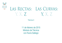 Las Rectas: Las Curvas: Y, X, Z Y, X, Z Técnica 3 11 de febrero de 2015 Módulo de Técnica con Nuria Gallego ZR La recta Sagital ZR • Ahora se trata de desplazarse por la recta del eje sagital • Al igual que en las demás rectas se tiene que poner atención en no torcer, ni girar, ni volcar, el tórax o la pelvis, sino de mantenerlos tanto adelante como atrás en el plano. ZR en la Cabeza • Deslizar la cabeza en posición neutra por la recta sagital, de delante a detrás. • La barbilla se debe de mantener el mismo punto durante el desplazamiento. • Se usan los músculos occipitales alternos con el esternocleidomastoideo y demás musculatura anterior, en sinergia con el cambio de peso de la cabeza hacia delante. ZR en la Cabeza ZR en la Cabeza • Cuando contraes los músculos de un sólo lado obtenemos la inclinación de un lado, para poder obtener la linea recta de la sagital hay que contraer un poco los antagonistas. y desplazar el peso de la cabeza • Para encontrar los músculos correspondientes hacemos un ejercicio isométrico: hay que apretar la cabeza contra un pañuelo o cinta que se sujeta con ambas manos. Si se quiere aprender la sagital por detrás colocaremos el pañuelo en la zona occipital superior, y si la queremos por delante la colocaremos en la zona frontal. Ejercicios ZR Cabeza 1- Ejercicios Isométricos: • coloca la mano derecha en la parte superior de la frente y presionar contra la mano. • después de unas cuantas repeticiones retiramos la mano y probamos in ella. • repetir por el otro lado. ✴ si no son capaces de mantener su propia mano en estático se puede probar de las siguientes maneras: con una compañera que sea que la que haga de punto fijo con una estantería o saliente de casa/clase que esté a la altura de la cabeza. Ejercicios ZR Cabeza 2- ZR Cabeza estático: • sentadas en el suelo colocar una mano delante de la frente y otra detrás de la cabeza a dos dedos de distancia A. desplazar suavemente tocando una mano y luego la otra B. desplazar fuerte y seco tocando una mano y luego la otra C. desplazar fuerte y seco en dos tiempos hasta llegar a la mano (puede hacerse en 3, 4, 5…. los que se quiera. • se trata de hacer drilling para fortalecer la musculatura del cuello • se puede hacer de pie pero hay que tener en cuenta que a las alumnas les cuesta más aislar este movimiento. Ejercicios ZR Cabeza 3- ZR Cabeza caminando: Tiempo > 1 2 3 4 A Paso con peso Dch ZR Delante Paso con peso Izq ZR Detrás B Paso con peso Dch ZR Delante C Paso con peso Dch D Paso con peso Dch ZR Delante Detrás Paso con peso Izq ZR Delante Detrás E Paso con peso Dch ZR Delante Detrás Paso con peso Izq ZR Delante Detrás Paso con peso Izq ZR Detrás ZR Delante Detrás ZR Delante Detrás Paso con peso Izq ZR Delante Detrás ZR Delante Detrás a) en planta / en punta c) hacia derecha/ hacia izquierda b) hacia delante / hacia atrás d) paso perseguido / paso cruzado ZR en el Torso • Cuando se realiza en el tórax, al llevarlo hacia delante se contraen principalmente los músculos largos de la espalda, mientras que los abdominales soportan el contrapeso. ZR en el Torso • Cuando lo llevo hacia detrás se contraen los abdominales mientras los músculos largos de la espalda soportan el contrapeso. ZR en el Torso • Hay que tener mucho cuidado de no mezclarlo con el volquete. • Para ello nos imaginamos que estamos asomadas en un balcón que tiene la barandilla a la altura de la pelvis (de esta manera la pelvis está bloqueada por la barandilla) y que alguien nos empuja y como no me quiero caer aguanto el pecho arriba. Ejercicios ZR Torso 1- Drilling estático A. contraer sólo la musculatura de la espalda e ir poniendo el peso del torso delante, e ir aumentando la velocidad. B. contraer solo los abdominales superiores a la vez q llevas el peso del torso detrás, ir aumentando la velocidad. No mover los hombros. C. contraer delante y detrás alternamente pero siempre relajando en medio. D. c pero sin relajar en medio. Ejercicios ZR Torso 2- ZR Torso caminando: Tiempo > 1 2 3 4 A Paso con peso Dch ZR Delante Paso con peso Izq ZR Detrás a) en planta / en punta c) hacia derecha/ hacia izquierda b) hacia delante / hacia atrás d) paso perseguido / paso cruzado ZR en el Torso FALLOS Y SOLUCIONES 1. Si al deslizarse por el torso se baja por delante: hay que recurrir a las imágenes que hagan que el torso suba (como el balcón). 2. Contramovimiento en la pelvis: Quizás habría que disminuir más aún el movimientos del torso. ZR en la Pelvis • Para realizarlo con la pelvis hay que tirar hacia atrás de la pelvis contrayendo fuertemente los abdominales inferiores a la vez que se mantiene la tensión muscular de la espalda, para que no se incline el busto. • Cuando se desplaza hacia delante hay que tener mucho cuidado de no volcar la pelvis hacia delante, esto se evita tirando de los músculos del pubis hacia arriba. ZR en la Pelvis • Hay que tener cuidado y no poner volquete en el movimiento. • Esta recta no se baila habitualmente sola, sino que va acompañada con otra curva o recta para formar figuras. • No es un movimiento que se realice a una velocidad rápida, más bien media o lenta, pero su drilling es muy importante para darle amplitud a los movimientos combinados en los que esta implicada. Ejercicios ZR Pelvis 1- Drilling estático A. contraer los abdominales inferiores e ir hacia delate con el peso de la pelvis y la ayuda de los tobillos e ir aumentando la velocidad. B. contraer los abdominales inferiores e ir hacia detrás con el peso de la pelvis y la ayuda de los tobillos e ir aumentando la velocidad. C. contraer delante y detras alternamente pero siempre relajando en medio. D. c pero sin relajar en medio. Ejercicios ZR Pelvis 2- ZR Pelvis caminando: • Cuando caminamos tenemos que tener en cuenta que se realiza la sagital sobre la pierna que tiene el peso y nunca al contrario. • Hay que caminar pasando el peso de un pie a otro y siempr