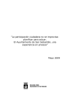 “La participación ciudadana no se improvisa: planificar para actuar. El Ayuntamiento de San Sebastián, una experiencia en proceso” Mayo 2009 1 Titulo: “La participación ciudadana no se improvisa: planificar para actuar. El Ayuntamiento de San Sebastián, una experiencia en proceso” Objeto: Es objeto de este documento presentar el proceso que esta desarrollado el Ayuntamiento de San Sebastián para planificar la participación que promueve la institución municipal en la acción de su Gobierno. Resumen: La Alcaldía de San Sebastián, por medio del departamento de Participación Ciudadana y del resto de áreas municipales, viene impulsando desde hace años dinámicas de participación que buscan la implicación de la ciudadanía en los procesos de toma de decisiones municipales. El Gobierno Municipal, con la intención de avanzar en este camino de profundización de la democracia local y dar un salto cualitativo en estas iniciativas, decidió iniciar en la legislatura 2003-07, un proceso para la elaboración de un plan de participación municipal, un documento que ordenara y articulara entre si las diferentes iniciativas, reforzando y dando una mayor coherencia a la actuación municipal en esta materia. Se trataba de dotarnos, partiendo de un diagnostico común y compartido, de un instrumento de planificación que nos permitiera responder al reto que supone hacer de la participación algo transversal a toda la organización municipal y que pueda estar presente en todas las fases de las actuaciones públicas. Se describe a continuación el proceso desarrollado, conseguidos, y los retos del futuro inmediato los resultados 2 La participación ciudadana en las políticas locales en San Sebastián La promoción de la participación ciudadana del Ayuntamiento de San Sebastián viene avalada por una tradición contrastada en el fomento de canales, espacios y mecanismos de participación a lo largo de los años; órganos de participación estables, procesos participativos sobre temas específicos y vinculados a proyectos concretos, planes transversales, audiencias, procesos de participación comunitaria en barrios, … también aspectos más cotidianos, en el día a día y la relación con una ciudadanía y un tejido social activo y dinámico, buscan todos facilitar la intervención de la ciudadanía y de sus asociaciones en la gestión municipal, en la gestión de lo colectivo, de la cosa pública. El Gobierno Municipal, con la intención de mejorar la calidad de estas iniciativas y avanzar en la profundización de la democracia local, decidió en la legislatura pasada iniciar un proceso de reflexión colectiva que partiendo de la experiencia, permitiera definir un marco conceptual, establecer unos objetivos comunes, y clarificar, ordenar y articular entre si las diferentes iniciativas para reforzar y dar mayor coherencia a la actuación municipal en esta materia. El impulso, avance e innovación en el ámbito de la participación ciudadana exige que esta sea entendida como una tarea a abordar de forma transversal por toda la organización y que pueda estar presente en todas las fases de las actuaciones públicas. Todos estos aspectos no pueden improvisarse, como sucede en otros ámbitos, exige también una planificación que de encaje a las diferentes piezas en un puzzle con un objetivo común. La participación precisa de planificación, de una planificación que nos permita dirigir la actuación municipal por los objetivos que queremos conseguir, poniendo medios y recursos y actuando para integrar la complejidad de los procesos de intervención pública y de sus actores (políticos, técnicos y ciudadanos), articular la potencialidad y la capacidad de los ciudadanos para participar en la gestión de lo público, secuenciar las acciones a desarrollar y definir la relación de todos los aspectos que lo conforman. Ya en aquel momento, entendíamos que iniciábamos un proceso que necesitaba ser construido de forma gradual; que avanzaría y se desarrollaría en la medida que el conjunto de la organización incorporara instrumentos de planificación y control. Apostar por planificar no significaba para nosotras elaborar y aprobar un documento, sino que significaba fundamentalmente apostar por una nueva forma de hacer que en su desarrollo necesitaba promover una nueva cultura en el conjunto de la organización. 3 El proceso de planificación: etapas Diagnóstico inicial Se trataba de analizar de forma sistemática las estructuras y actuaciones municipales con relación al impulso de la participación en las políticas públicas; queríamos diagnosticar las experiencias desarrolladas por el Ayuntamiento en esta materia, analizar lo que hasta el momento se había realizado, viendo qué cosas habían funcionado, qué cuestiones había que corregir, para impulsar, desde un diagnóstico común y un compromiso compartido, un plan municipal de participación que respondiera al reto que supone hacer de la participación algo transversal a toda la organización municipal. El objetivo fundamental de este diagnóstico era analizar los programas y espacios de participación existentes (los modelos y sus características), los canales de información y comunicación, los recursos e infraestructuras orientadas a promocionar la participación, las líneas de colaboración con el tejido asociativo, los obstáculos y las potencialidades existentes en la promoción que hacía el Ayuntamiento de Donostia para garantizar el derecho a la participación. Este diagnóstico, paso previo necesario para el diseño de un marco general de actuación en materia de participación ciudadana, recogía así nuestra práctica y realidad cotidiana para actuar de cara al futuro de forma realista, a partir, y teniendo siempre en cuenta, la experiencia acumulada. ¡Error! P la n te a m ie n to m e to do ló g ic o FASE 1 A ju s t e m e to d o ló g ic o y p r e s e n ta c ió n d e l p r o y e c to FASE 2 R e c o g id a d e i