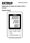 El SD910 es un monitor de tensión de tres canales de 0 a 300 mV o 0 a 3000mV CD y registrador de datos. Los datos se guardan a una frecuencia seleccionable y para facilitar la exportación a software de hoja de cálculo. Este instrumento se embarca completamente probado y calibrado y con uso apropiado le proveerá muchos años de servicio confiable. Por favor Visite nuestra página en Internet: (www.extech.com) para la última versión de este Manual del usuario, actualizaciones de producto, Registro del Producto y Soporte al Cliente. Características