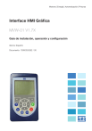 Motores | Energía | Automatización | Pinturas Interface HMI Gráfica MVW-01 V1.7X Guía de instalación, operación y configuración Idioma: Español Documento: 10000353292 / 00 Summary ÍNDICE 1 INTRODUCCIÓN.........................................................................................5 2 INSTALACIÓN DE LA HMI GRÁFICA EN EL TABLERO / ARMARIO.................. 5 3 INICIANDO EL USO DE LA HMI GRÁFICA..............................................7 3.1 MODOS BÁSICOS DE VISUALIZACIÓN DE LA HMI GRÁFICA....................... 8 3.2 ESTRUCTURA DE GRUPOS Y PARÁMETROS................................................. 9 3.2.1 Modo de Acceso Secuencial...................................................................10 3.2.2 Modo de Acceso por Grupos de Menús................................................10 4 EDICIÓN DE PARÁMETROS................................................................... 12 4.1 NUMÉRICA...........................................................................................................12 4.2 ALFANUMÉRICA.................................................................................................12 5 CONFIGURANDO LA HMI GRÁFICA...................................................... 13 5.1 CONTRASTE DEL LCD.......................................................................................13 5.2 CONFIGURANDO LOS COMANDOS DE LA HMI............................................13 5.3 CONFIGURANDO LOS PARÁMETROS DE LECTURA DEL MODO DE MONITOREO..............................................................................................................14 5.4 CONFIGURANDO LA FUNCIÓN GRÁFICA ON-LINE O FUNCIÓN WATCH...14 6 ALARMAS Y FALLAS............................................................................... 15 6.1 VENTANA DE ALARMAS/FALLAS.....................................................................15 6.2 VENTANA DE AVISOS.........................................................................................16 6.3 LOG DE ERRORES..............................................................................................17 7 FUNCIÓN HELP........................................................................................ 17 8 DESCRIPCIÓN DE LOS PARÁMETROS DE LA HMI GRÁFICA............ 18 Interface HMI Gráfica MVW-01 1 INTRODUCCIÓN La interface HMI Grafica (del inglés, HMI - Human Machine Interface, o HMI - Interface Hombre Máquina) proporciona una serie de nuevos recursos al convertidor de frecuencia de media tensión MVW-01, siendo: Visualización: modo de visualización en modo texto y en modo gráfico. Monitoreo: hasta 6 parámetros pueden ser monitoreados simultáneamente en la pantalla. Navegación: sistema de navegación por menús con adición de barras de rodaje y nuevas teclas. Función de ayuda on-line: ayuda en la propia HMI (en la versión 1.7X solamente parámetros). Editar: nuevas teclas para facilitar la edición de parámetros. El “design”, las mejorías y nuevas funciones de la HMI Gráfica poseen forma de uso, navegación y programación semejantes a de la HMI usada en la línea CFW-11, tornando el uso todavía más fácil para quien conoce esta línea de productos WEG (consulte la figura 1.1). Help disponible Estado del Convertidor Sentido de Giro Velocidad Motor Local/Remoto Hora Softkey 1 Tecla Softkey 1 Softkey 2 Tecla Softkey 2 Tecla Help Tecla Prog/Enter Figura 1.1: HMI Gráfica para convertidor de frecuencia MVW-01 2 INSTALACIÓN DE LA HMI GRÁFICA EN EL TABLERO / ARMARIO La instalación de la HMI en el tablero/armario es hecha sin la necesidad del uso de la moldura de soporte, siendo que la fijación es hecha directamente a través de los tornillos ubicados en las aletas móviles posicionadas en la tapa trasera de la HMI, de acuerdo con la figura 2.1. MVW-01 | 5 Interface HMI Gráfica MVW-01 R4 10 7 7 18 16 Figura 2.1: Dimensionado del corte del tablero/armario y fijación de la HMI Gráfica La conexión de la HMI Gráfica con la tarjeta MVC2 es hecha con el mismo cable de la HMI convencional, siendo que el punto de conexión del cable en la tarjeta MVC2 también es el conector XC8. ¡NOTA! Ninguna configuración adicional es necesaria hacer en el hardware de la tarjeta MVC2, pues el mismo reconoce el tipo de HMI conectada automáticamente. ¡ATENCIÓN! La versión de software de la tarjeta MVC2 debe ser 1.7X o posterior para que la HMI Gráfica funcione. ¡NOTA! Las versiones de software de la tarjeta MVC2 y de la HMI Gráfica deben ser compatibles. Por ejemplo: si la versión de software de la HMI Gráfica es 1.7X y la versión de la tarjeta MVC2 es 1.8X o posterior, la HMI no funcionará correctamente y un aviso de versión de software incompatible será presentado. ¡ATENCIÓN! Es recomendado que el rack de control sea desenergizado para la conexión de la HMI Gráfica a la tarjeta MVC2. 6 | MVW-01 Interface HMI Gráfica MVW-01 3 INICIANDO EL USO DE LA HMI GRÁFICA La comunicación entre la HMI Gráfica y el convertidor de frecuencia es del tipo protocolo MODBUS RTU (38400 bps, sin paridad, con 2 stop bits), usando como medio físico el canal RS-485. La HMI Gráfica funciona como el maestro de la comunicación. Cuando el tablero/armario es energizado la HMI Gráfica hace una inicialización de los parámetros con la tarjeta MVC2. Durante este proceso son presentadas las versiones de software de la HMI Gráfica y de las tarjetas de control del MVW-01. La información del parámetro que está siendo transferido y una barra del progreso también son presentadas durante el proceso de inicialización (consulte a figura 3.1). Sub LOC 0 rpm Transferencia de Parámetros ... 30% P211:Bloq.por Vel. Nula Versión de SW HMI Versión de SW MVC2 Versión de SW MVC1 1.70 1.70 1.70 00:00 Figura 3.1: Inicialización de la HMI Gráfica ¡NOTA! Para iniciar el uso de la HMI Gráfica (navegación y edición de parámetros) basta que la inicialización sea concluida con suceso, sendo que ninguna pr