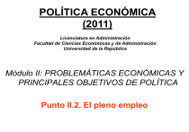 POLÍTICA ECONÓMICA (2011) Licenciatura en Administración Facultad de Ciencias Económicas y de Administración Universidad de la República Módulo II: PROBLEMÁTICAS ECONÓMICAS Y PRINCIPALES OBJETIVOS DE POLÍTICA Punto II.2. El pleno empleo II. PROBLEMÁTICAS ECONÓMICAS Y PRINCIPALES OBJETIVOS DE POLÍTICA II.1. II.2. II.3. II.4. II.5. El crecimiento económico Antecedentes, concepto y medición. Factores determinantes del crecimiento económico. El crecimiento desde el corto y largo plazo. Planteamientos teóricos recientes y medidas a favor del crecimiento. El pleno empleo Antecedentes, concepto y medición. Conceptos básicos y tipología del desempleo. Planteamientos teóricos sobre el mercado de trabajo y políticas de empleo. La estabilidad de precios Antecedentes, concepto, medición y previsión. Efectos de la inflación. Principales teorías sobre la inflación. Las medidas de estabilización de precios. El equilibrio externo Antecedentes, concepto y medición. La Balanza de Pagos y el tipo de cambio. Significado macroeconómico y factores causantes del desequilibrio externo. El ajuste externo: concepto y mecanismos. Otros objetivos claves Calidad de vida, conservación del medio ambiente y redistribución de la riqueza. Antecedentes, concepto y medición en cada caso. Diferentes políticas al respecto. II.2. El pleno empleo i. Cuadrado Roura (2001), Cap. 6 Antecedentes, concepto y medición. ii. Conceptos básicos y tipología del desempleo. iii. Planteamientos teóricos sobre el mercado de trabajo y políticas de empleo. i. Antecedentes, concepto y medición 3 puntualizaciones previas • La estabilidad interna de una economía está determinada (al menos) por el equilibrio en 2 mercados: – El de bienes y servicios. – El de trabajo, el cual posee muchas particularidades que lo hacen “especial”. • Hasta no hace mucho tiempo, el trabajo era más bien agropecuario, lo que condujo a estancamiento económico durante siglos. – Por ello la preocupación central era como crecer para evitar miserias y catástrofes, y no el tema del empleo. • Aparte, en el mundo precapitalista, el hombre trabajaba en lo que hacia su familia o mediante algún mecanismo institucionalizado de asignación del trabajo. – Con el mundo capitalista, eso se rompe. • Existe una demanda de trabajo por parte de empresarios. • Y una oferta de gente que no tiene más que su fuerza de trabajo. • Es decir, ahora el trabajo también tiene su mercado y allí se fijará su precio y cantidad (salario y nivel de empleo). Apuntes históricos • Keynes: “El gran arte para hacer que una nación sea feliz y lo que llamamos floreciente, consiste en dar a todos y cada uno la oportunidad de estar empleados”. • Durante el siglo XIX y hasta la crisis de 1929, el empleo se correlacionaba positivamente con el crecimiento económico. – Y por tanto con sus fluctuaciones. – Así, empleo y desempleo van a estar íntimamente unidos. – Y el desempleo se convierte en parte consustancial del sistema capitalista => la mayor debilidad de las economías de mercado!!! – Pero luego de la crisis, el desempleo es un fenómeno social muy grave!!! Principales teorías: visión de la teoría clásica • Es natural que cierto desempleo exista – No se puede hacer nada. • Estado mínimo. • Política fiscal solo desplaza actividad privada (consumo y/o inversión). • Neutralidad del dinero. – Hay que esperar fase expansiva de la economía y que el mercado con su oferta y demanda ajuste!! • Política hacia el aumento de la oferta en todo caso. – Es decir, creando condiciones para que el mercado conduzca a mayor crecimiento. Principales teorías: visión de Keynes (I) • Indica errores en los planteos clásicos. • Abre la posibilidad de que el pleno empleo pase a ser un objetivo fundamental de la política económica. – Su libro de 1936 contenía un estudio de las causas y medidas para salir de la crisis. – El eje principal de dicha obra: el desempleo es un problema macroeconómico y así hay que tratarlo!!! • Cuando millones están en desempleo => no es por sus características individuales (vagos, etc.). • No es que haya falta de otros factores productivos: dado que en la crisis están subutilizados. • Que el desempleo varía en contramano con la actividad económica. • Que tal vínculo está relacionado con la demanda agregada, dado que la oferta varía muy poco de año en año. • La desocupación masiva no es causa de la tecnología. – Que en el largo plazo ha sido positiva para aumentar la calidad de vida!! Principales teorías: visión de Keynes (II) • La política monetaria y fiscal son los medios más poderosos para aumentar la demanda agregada. • Si se prescinde de la política económica, una democracia casi no tiene herramientas para afrontar el desempleo. • A lo cual, claro está, hay que sumar que el desempleo de larga duración es un problema social: – Mina los cimientos sociales. – Deja fuera del mercado a mucha gente y destruye cualificaciones. • Todo ello lo hace un objetivo macroeconómico de primer orden!!! Las medidas y la conceptualización del objetivo pleno empleo en el siglo XX • Como muchas veces, los problemas en la realidad llevan a tomar medidas antes que las teorías se estructuren para darles marco… • Así, varios acontecimientos antes y después de la obra de Keynes (1936) aportaron a posicionar al objeto empleo como clave: – El “New deal” (1933) bajo la presidencia de Roosvelt para enfrentar las consecuencias de la crisis de 1929 – Informe Beveridge: Inglaterra 1943; donde se procura convertir al empleo y la protección social frente a la crisis en el objeto central de la política económica – Employment Act (1946): primer ley que declara la obligatoriedad de procurar el pleno empleo por parte de los poderes públicos – Naciones Unidas (1949): propone medidas para el ogro del pleno empleo – Durante la segunda parte del