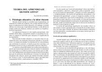 TEORÍA DEL APRENDIZJE SIGNIFICATIVO TEORIA DEL APRENDIZAJE SIGNIFICATIVO* Por DAVID AUSUBEL 1. Psicología educativa y la labor docente Durante mucho tiempo se consideró que el aprendizaje era sinónimo de cambio de conducta, esto, porque dominó una perspectiva conductista de la labor educativa; sin embargo, se puede afirmar con certeza que el aprendizaje humano va más allá de un simple cambio de conducta, conduce a un cambio en el significado de la experiencia. La experiencia humana no solo implica pensamiento, sino también afectividad y únicamente cuando se consideran en conjunto se capacita al individuo para enriquecer el significado de su experiencia. Para entender la labor educativa, es necesario tener en consideración otros tres elementos del proceso educativo: los profesores y su manera de enseñar; la estructura de los conocimientos que conforman el currículo y el modo en que éste se produce y el entramado social en el que se desarrolla el proceso educativo. Lo anterior se desarrolla dentro de un marco psicoeducativo, puesto que la psicología educativa trata de explicar la naturaleza del aprendizaje en el salón de clases y los factores que lo influyen, estos fundamentos psicológicos proporcionan los principios para que los profesores descubran por sí mismos los métodos de enseñanza más eficaces, puesto que intentar descubrir métodos por "Ensayo y error" es un procedimiento ciego y, por tanto innecesariamente difícil y antieconómico (Ausubel: 1983). * http://www.educainformatica.com.ar/docentes/tuarticulo/educacion/ ausubel/index.html 1 En este sentido una "teoría del aprendizaje" ofrece una explicación sistemática, coherente y unitaria del ¿cómo se aprende?, ¿Cuáles son los límites del aprendizaje?, ¿Porqué se olvida lo aprendido?, y complementando a las teorías del aprendizaje encontramos a los "principios del aprendizaje", ya que se ocupan de estudiar a los factores que contribuyen a que ocurra el aprendizaje, en los que se fundamentará la labor educativa; en este sentido, si el docente desempeña su labor fundamentándola en principios de aprendizaje bien establecidos, podrá racionalmente elegir nuevas técnicas de enseñanza y mejorar la efectividad de su labor. La teoría del aprendizaje significativo de Ausubel, ofrece en este sentido el marco apropiado para el desarrollo de la labor educativa, así como para el diseño de técnicas educacionales coherentes con tales principios, constituyéndose en un marco teórico que favorecerá dicho proceso. Teoría del aprendizaje significativo Ausubel plantea que el aprendizaje del alumno depende de la estructura cognitiva previa que se relaciona con la nueva información, debe entenderse por "estructura cognitiva", al conjunto de conceptos, ideas que un individuo posee en un determinado campo del conocimiento, así como su organización. En el proceso de orientación del aprendizaje, es de vital importancia conocer la estructura cognitiva del alumno; no sólo se trata de saber la cantidad de información que posee, sino cuales son los conceptos y proposiciones que maneja así como de su grado de estabilidad. Los principios de aprendizaje propuestos por Ausubel, ofrecen el marco para el diseño de herramientas metacognitivas que permiten conocer la organización de la estructura cognitiva del educando, lo cual permitirá una mejor orientación de la labor educativa, ésta ya no se verá como una labor que deba desarrollarse con "mentes en blanco" o que el aprendizaje de los alumnos comience de "cero", pues no es así, sino que, los educandos tienen una serie de experien- TEORÍA DEL APRENDIZJE SIGNIFICATIVO cias y conocimientos que afectan su aprendizaje y pueden ser aprovechados para su beneficio. Ausubel resume este hecho en el epígrafe de su obra de la siguiente manera: "Si tuviese que reducir toda la psicología educativa a un solo principio, enunciaría este: El factor más importante que influye en el aprendizaje es lo que el alumno ya sabe. Averígüese esto y enséñese consecuentemente". Aprendizaje significativo y aprendizaje mecánico Un aprendizaje es significativo cuando los contenidos: Son relacionados de modo no arbitrario y sustancial (no al pie de la letra) con lo que el alumno ya sabe. Por relación sustancial y no arbitraria se debe entender que las ideas se relacionan con algún aspecto existente específicamente relevante de la estructura cognoscitiva del alumno, como una imagen, un símbolo ya significativo, un concepto o una proposición (Ausubel, 1983 :18). Esto quiere decir que en el proceso educativo, es importante considerar lo que el individuo ya sabe de tal manera que establezca una relación con aquello que debe aprender. Este proceso tiene lugar si el educando tiene en su estructura cognitiva conceptos, estos son: ideas, proposiciones, estables y definidos, con los cuales la nueva información puede interactuar. El aprendizaje significativo ocurre cuando una nueva información "se conecta" con un concepto relevante ("subsunsor") pre existente en la estructura cognitiva, esto implica que, las nuevas ideas, conceptos y proposiciones pueden ser aprendidos significativamente en la medida en que otras ideas, conceptos o proposiciones relevantes estén adecuadamente claras y disponibles en la estructura cognitiva del individuo y que funcionen como un punto de "anclaje" a las primeras. A manera de ejemplo en física, si los conceptos de sistema, trabajo, presión, temperatura y conservación de energía ya existen en la estructura cognitiva del alumno, estos servirán de 2 subsunsores para nuevos conocimientos referidos a termodinámica, tales como máquinas térmicas, ya sea turbinas de vapor, reactores de fusión o simplemente la teoría básica de los refrigeradores; el proceso de interacción de la nueva información con la ya existente, produce una nueva modificación de los conceptos subsunsores (trabajo, conservación de energía, etc.), esto implica que los subsunsores