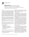 Designation: E 542 – 01 Standard Practice for Calibration of Laboratory Volumetric Apparatus1 This standard is issued under the fixed designation E 542; the number immediately following the designation indicates the year of original adoption or, in the case of revision, the year of last revision. A number in parentheses indicates the year of last reapproval. A superscript epsilon (e) indicates an editorial change since the last revision or reapproval. This standard has been approved for use by agencies of the Department of Defense. volume of water either contained in or delivered by the vessel. Procedures are given for cleaning, setting the meniscus, manipulating the apparatus, weighing, and converting the weight to the appropriate standard volume. 1. Scope 1.1 This practice covers procedures for use in the calibration of volumetric ware, in accordance with Specification E694 such as is in common use in chemical and clinical laboratories. It is based on the gravimetric determination of the quantity of water either contained or delivered, and the conversion of this value to true volume at the standard temperature of 20°C by means of suitable equations and standard tables. Calibration using mercury is excluded. Calibration may be performed using alternative gravimetric methodology, provided that it is demonstrated and documented that the results obtained are equivalent to those obtained using the methodology described herein. 1.2 This practice is intended to encompass capacity ware between the limits of 0.1 cm3 and 2000 cm3. Typical products falling within the purview of this practice are burets graduated“ to deliver”, graduated cylinders, volumetric flasks, specific gravity flasks, measuring and dilution pipets, and transfer and capacity pipets. 1.3 The procedures are not recommended for calibration of apparatus with capacities below 0.1 cm3, such as microglassware. 1.4 This standard does not purport to address all of the safety concerns, if any, associated with its use. It is the responsibility of the user of this standard to establish appropriate safety and health practices and determine the applicability of regulatory limitations prior to use. 4. Significance and Use 4.1 The primary purpose of this practice is to provide uniform procedures that may be used to accurately calibrate a wide variety of volumetric ware. The techniques are simple in concept and can provide reliable results, provided the procedures are followed faithfully. Accordingly, the practice should provide a means for checking the original calibration of glassware and similar apparatus and for periodic rechecks as the need should arise. 4.2 Borosilicate volumetric glassware will hold its calibration indefinitely provided that it is not exposed to hydrofluoric acid, hot phosphoric acid, or strong, hot alkalis, and that it is not heated above 150°C when dry. A frosting of the glass surface (viewed when dry) indicates that chemical attack has occured, and recalibration may be in order. As a precaution, however, it is recommended that the glassware be recalibrated after ten years of service regardless of its appearance. 4.3 Soda-lime volumetric glassware will become frosted with time because of attack from moisture in the atmosphere as well as from the chemicals mentioned above. In addition, it should not be heated above 90°C when dry. It is recommended, therefore, that it be recalibrated after five years of service unless frosting (viewed when dry) is observed sooner. 2. Referenced Documents 2.1 ASTM Standards: E 1 Specification for ASTM Thermometers2 E 694 Specification for Volumetric Ware3 SI 10 Standard for Use of the International System of Units (SI) (the Modernized Metric System)3 5. Units of Measurement 5.1 Capacity—The basic SI unit for volume is the cubic metre, m3. Due to its large size, it is rarely used in volumetric calibration. Rather, the cubic centimetre, cm3, is used and will be employed in this practice. The unit, millilitre, mL, may be considered as equivalent to the cubic centimetre. 5.2 Standard Temperature—Volumetric ware is almost universally calibrated at 20°C. The procedures described provide for such a calibration. When it is necessary to work at higher ambient temperatures, such as is the case in tropical countries, calibration may be required at the International Standards Organization (ISO) recommended temperature of 27°C. Equations are given to correct the calibrated volume to other temperatures as this may be required or desired. 3. Summary of Practice 3.1 This practice is based upon a determination of the 1 This practice is under the jurisdiction of ASTM Committee E41 on Laboratory Apparatus, and is the direct responsibility of Subcommittee E41.01 on Apparatus. Current edition approved Octo. 10, 2001. Published January 2002. Originally published as E 542 – 79. Last previous edition E 542 – 00. 2 Annual Book of ASTM Standards, Vol 14.03. 3 Annual Book of ASTM Standards, Vol 14.04. Copyright © ASTM International, 100 Barr Harbor Drive, PO Box C700, West Conshohocken, PA 19428-2959, United States. 1 E 542 ware should be cleaned in an appropriate manner before calibration. 7.3 Reading and Setting a Liquid Meniscus: 7.3.1 Reading the Meniscus—For all apparatus calibrated by this procedure, the reading is made on the lowest point of the meniscus. In order that the lowest point may be observed, it is necessary to place a shade of some dark material immediately below and behind the meniscus, which renders the profile of the meniscus dark and clearly visible against a light background. A convenient device for this purpose is a collarshaped section of thick black rubber tubing, cut open at one side and of such size as to clasp the tube firmly. Alternatively, black paper may be used. “Short line” graduated vessels where the lines are less than one half of the circumference may be read more accurately by placing a mirror against the rear of the vessel to reflect the front line.