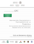 Prevención , Diagnóstico y Tratamiento de la Varicela en el Paciente Pediátrico en el Primer Nivel de Atención Prevención , Diagnóstico y Tratamiento de la Varicela en el Paciente Pediátrico en el Primer Nivel de Atención Niñ@ que acude al modulo de vacunación para que se le administre la primera dosis de vacuna contra varicela El módulo de vacunación cumple con todos los siguientes requisitos: · · · · · Tiene vacuna disponible. La vacuna no esta caducada. La red de frío de la vacuna es adecuada. Tiene personal capacitado para vacunar y para tratar las reacciones adversas post vacunales. Tiene todos los recursos materiales para vacunar y tratar las reacciones adversas post vacunales. No No vacune y refiera de inmediato al centro de salud más cercano donde se tengan todos los recursos humanos y materiales óptimos para su vacunación Si ¿Ya tuvo varicela? No vacune Si No ¿Estuvo expuesto a paciente con varicela en los últimos 15días? Si Siga el algoritmo del manejo postexposición con paciente con varicela No Presenta alguno de los siguientes factores de riesgo: · · · · · Ha presentado reacciones alérgicas a otras vacunas que contengan ovoproteína, gelatina o neomincina. Adolescente con sospecha o confirmación de embarazo actual. Haber recibido inmunoglobulina en último mes. Ha tomado corticoesteroides, salicilatos, anticoagulantes en los últimos 15 días de forma continua. Paciente con enfermedades de inmunocompromiso. Si No vacune y refiera de inmediato a segundo nivel de atención médica para su manejo vacunal No ¿Qué edal tiene el (la) niñ@)? < 1año de edad 1 a 18 años de edad Informe a los padres de familia por escrito sobre: No vacune, e informe a los padres de familia que el esquema de vacunación contra varicela es hasta el año de edad. *Solo se deberá vacunar en caso de brote epidémico a partir de los 9 meses de edad. · · · · · Los esquemas de vacunación y los ajustes vacunales. Los riesgos y beneficios de la vacunación contra varicela. Los signos de alarma de las reacciones postvacunales. El manejo de las principales reacciones postvacunales. La persona que vacuna firma el consentimiento informado al igual que el padre responsable del (de la) niñ El esquema san@s: · habitual de niñ@s Cuando los niñ@s san@s que nunca hayan sido vacunados contra varicela en las edades indicadas se vacunará de la siguiente manera: Primera dosis: 0.5 ml de dosis de vacuna contra varicela vía subcutánea al cumplir 1 año de edad. · · Segunda dosis: 0.5ml de dosis de vacuna contra varicela vía subcutánea al cumplir los 4 a 6 años de edad. · En niñ@s san@s mayores de 12 años de edad que no hayan recibido ninguna vacuna contra varicela: Administre dos dosis de 0.5 ml de vacuna contra varicela vía subcutánea con un intervalo mínimo de 3 meses de separación entre ambas Administre dos dosis de 0.5 ml de vacuna contra varicela vía subcutánea con un intervalo mínimo de 1 mes de separación entre ambas. · · Cuando los niñ@s san@s hayan sido vacunados contra varicela en una sola ocasión previa, se vacunará de la siguiente manera: Administre una dosis de 0.5 ml de vacuna contra varicela vía subcutánea. En niñ@s san@s mayores de 12 años de edad que hayan sido vacunados contra varicela en una sola ocasión previa: Administre dos dosis de 0.5 ml de vacuna contra varicela vía subcutánea con un intervalo mínimo de 1 mes de separación entre ambas. Mantega al niñ@ vacunado en observación en el módulo de vacunación por los siguientes 30 minutos posteriores a la vacunación. Se sigue algoritmo de manejo de reacciones adversas post vacunales. Si ¿Se presentó en el módulo de vacunación alguna reacción adversa postvacunal? Alta a su domicilio en donde se vigilará por los padres signos de No alarma y en caso de presentarse se acudirá de inmediato hospital más cercano. al Prevención , Diagnóstico y Tratamiento de la Varicela en el Paciente Pediátrico en el Primer Nivel de Atención Niñ@ que se encuentra en módulo de vacunación ¿Presenta datos sugestivos de reacción inmediata o mediata adversa por vacunación?* Se envía a su domicilio con signos de alarma No Si Valore Apariencia Tome signos Vitales Valore Habitus externo · · · · · · · · Glasgow pediátrico Respuestas pupilares Estado de hidratación Coloración anormal de tegumentos Automatismo ventilatorio Patrón respiratorio Datos de dificultad respiratoria Sangrado activo visible · · · · Mantenga la calma. Pida ayuda (a su enfermera, a su secretaria, al padre de familia) para traer personal médico avanzado Permeabilice la vía aérea Administre oxígeno a en mascarilla con reservorio a 5 lt/min. Obtenga el peso del paciente · · · · · · Frecuencia Cardiaca Frecuencia Respiratoria Presión Arterial Sistémica Temperatura Oximetría de pulso Glucométria · · · · · Facies de dolor Posturas anormales Movimientos anormales Marcha anormal Lesiones cutáneas Trate al paciente de acuerdo al cuadro clínico que presente Edema laríngeo Broncoespasmo Choque anafiláctico Naúseas, vómito Fiebre o dolor Urticaria Administre: Betametasona: VO: 0.02 a 0.25 mg/kg/día divididos cada 6 a 8 hrs IM: 0.02 a 0.12 mg/kg/día divididos cada 6 a 12 horas Administre: Administre: · · · Dexametasona IM: 0.6 mg/kg (dosis máxima de 16mg/día). 3 Nebulizaciones en una hora con adrenalina de 1mg/1ml a dosis de 0.5 ml/kg/dosis (dosis máxima: en menores de 4 años 2.5 ml y en mayores de 4 años: 5ml o bien con adrenalina racémica a dosis de 0.05 ml/kg/dosis (dosis máxima de 0.5ml por nebulización) Nebulice al paciente con ambiente frío. · · · Dexametasona IM: 0.5 mg/kg (dosis máxima de 16mg/día). Canalice y administre sol. Ringer lactato a 20 a 60 ml/kg/hr. 3 Nebulizaciones en una hora con Salbutamol a dosis de 0.15 mg/kg dosis de la sol. De 5 mg/ml. Administre: En caso de no haber mejoría, canalice al paciente y administre aminofilina a dosis impregnación de: