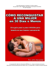 Cómo Reconquistar a Una Mujer en 30 Días o Menos: Una guía paso a paso, infalible, para tenerla en sus brazos nuevamente Por John Alexander -1© Copyright 2007-2009 John Alexander Enterprises, Inc., Todos los derechos reservados. Este ebook es exclusivamente para que usted lo use, y no puede darlo ni venderlo a terceras personas. Cómo Reconquistar a Una Mujer en 30 Días o Menos: Una guía paso a paso, infalible, para tenerla en sus brazos nuevamente Por John Alexander Aviso legal de derechos de autor Este ebook es estrictamente para uso personal. 1. Usted no puede regalar este ebook. 2. Usted no puede revender este ebook. Este ebook está registrado en la oficina de copyright de los Estados Unidos y está protegido por leyes de copyright internacionales. Las leyes federales de los Estados Unidos estipulan penas de hasta 3 años de prisión y multas de hasta $150.000 por descargar y/o compartir archivos protegidos por copyright. Queda prohibido cualquier uso indebido, reproducción, robo, o distribución no autorizados de este ebook. El autor de este libro investiga las violaciones de copyright de manera regular y activa, e iniciará procedimientos judiciales contra cualquiera que robe este trabajo, con el mayor rigor permitido por la ley. Si usted ha obtenido este ebook por cualquier medio que no haya sido descargarlo desde alphamalesystem.com, getagirlback.com o re-attraction.com, por favor infórmelo a [email protected] Al leer este libro, usted reconoce que al usar este material usted respetará todas las leyes federales, estatales, y locales. Usted también acepta no responsabilizar al autor de este material por ninguna consecuencia de acciones indebidas que usted pueda emprender. En español sencillo, ¡usted es responsable de su propio comportamiento y espero que usted actúe responsablemente! Ahora, comencemos con los buenos consejos… -2© Copyright 2007-2009 John Alexander Enterprises, Inc., Todos los derechos reservados. Este ebook es exclusivamente para que usted lo use, y no puede darlo ni venderlo a terceras personas. Cómo Reconquistar a Una Mujer en 30 Días o Menos: Una guía paso a paso, infalible, para tenerla en sus brazos nuevamente Por John Alexander Tabla de Contenidos Capítulo 1: Introducción al sistema y cómo le ayudará: 8 Capítulo 2: Su primera orden del día: 10 Capítulo 3: Errores comunes - ¿Cuántos de éstos ha cometido?: 17 Capítulo 4: Lo irónico: para recuperarla, olvídese de su ex… por ahora: 21 Capítulo 5: Tome el control de usted mismo - Vuelva a ser un hombre atractivo: 27 Capítulo 6: El próximo problema a resolver: Determinar qué fue lo que atrajo a su novia de usted al principio: 31 Capítulo 7: Qué constituye una buena relación, y dónde metió usted la pata: 35 Capítulo 8: Convertirse en un hombre atractivo para atraer irresistiblemente a su ex: 47 Capítulo 9: Mover el Dial de Atracción #1 - Ser un líder: 55 Capítulo 10: Mover el Dial de Atracción #2 - Belleza y estilo masculinos: 57 Capítulo 11: Mover el Dial #3 – Salud y fuerza física: 69 Capítulo 12: Mover el Dial de Atracción #4 – Confianza en sí mismo: 73 Capítulo 13: Mover el Dial de Atracción #5 – Ser feliz y no necesitado: 76 Capítulo 14: Mover el Dial de Atracción #6 – Tener otras mujeres interesadas en usted: 77 Capítulo 15: Mover el Dial de Atracción #7 – Ser popular: 80 Capítulo 16: Mover el Dial de Atracción #8 – Ud. es interesante, intrigante, divertido y encantador: 83 Capítulo 17: Mover el Dial de Atracción #9 – Usted es asertivo: 85 Capítulo 18: Mover el Dial de Atracción #10 – Usted la hace reír: 86 Capítulo 19: Mover el Dial Atracción #11 – Usted es ambicioso y apasionado en lo que hace: 88 Capítulo 20: Días 1-20 – Manténgase dentro de su vida de manera indirecta: 89 Capítulo 21: Cómo va usted a atraerla de nuevo: 91 Capítulo 22: El Proceso de Re-Conexión – Vuelva a atraer a su novia como un imán: 93 Capítulo 23: Día 21 – Llamarla: 96 Capítulo 24: Volver a conectarse con su novia y tenerla nuevamente en sus brazos: 99 Capítulo 25: Asegurarse de que ella se quede con usted: 106 Capítulo 26: Lidiando con situaciones específicas: 109 Capítulo 27: De Errores a Éxito Total: 115 Capítulo 28: Su magnífico futuro con su novia: 117 Otros productos de John Alexander: 118 -3© Copyright 2007-2009 John Alexander Enterprises, Inc., Todos los derechos reservados. Este ebook es exclusivamente para que usted lo use, y no puede darlo ni venderlo a terceras personas. Capítulo 1: Introducción al sistema y cómo le ayudará Antes que nada, permítame felicitarlo por comprar esta guía y recomendarle que respire profundamente. Si usted derrama otra lágrima, será una lágrima de felicidad porque usted CONSEGUIRÁ a su mujer nuevamente. Lo único que le pido es que: a) Siga este manual paso a paso, sin alterar ni alejarse de este mapa que he preparado para usted b) Dedíquele todo su esfuerzo. ¿Estamos de acuerdo? Excelente. De qué manera puedo ayudarlo Como autor del best-seller “underground” internacional Cómo convertirse en un macho alfa, (en www.recuperaratumujer.com/conquistador), he entrenado a un gran número de individuos no sólo en cómo salir con mujeres que acaban de conocer sino también en cómo volver a atraer a sus ex-novias*. Con esta guía no hago más que poner por escrito un sistema comprobado, que funciona, desarrollado para los hombres a quienes he ayudado con éxito a recuperar a sus ex novias. Mientras que Cómo convertirse en un macho alfa le enseña cómo atraer magnéticamente corrientes de nuevas mujeres hacia usted, esta guía le demuestra cómo atraer a su antigua novia. El sistema que usted está a punto de descubrir ha sido comprobado exhaustivamente en la práctica, así que yo le puedo prometer que funcionará para usted. Está basado en instintos innatos e irrefrenables de su ex-novia, de manera que esta guía es lo más cercano a lo infalible que usted podrá encontr