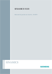 SINAMICS S120 Manual de puesta en marcha · 01/2011 SINAMICS s Manual de puesta en marcha ___________________ Prefacio Preparativos para la puesta 1 ___________________ en marcha SINAMICS S120 Manual de puesta en marcha Manual de puesta en marcha Válido para: Versión de firmware 4.4 (IH1), 01/2011 6SL3097-4AF00-0EP1 2 ___________________ Puesta en marcha 3 ___________________ Diagnóstico A ___________________ Anexo Notas jurídicas Notas jurídicas Filosofía en la señalización de advertencias y peligros Este manual contiene las informaciones necesarias para la seguridad personal así como para la prevención de daños materiales. Las informaciones para su seguridad personal están resaltadas con un triángulo de advertencia; las informaciones para evitar únicamente daños materiales no llevan dicho triángulo. De acuerdo al grado de peligro las consignas se representan, de mayor a menor peligro, como sigue. PELIGRO Significa que, si no se adoptan las medidas preventivas adecuadas se producirá la muerte, o bien lesiones corporales graves. ADVERTENCIA Significa que, si no se adoptan las medidas preventivas adecuadas puede producirse la muerte o bien lesiones corporales graves. PRECAUCIÓN con triángulo de advertencia significa que si no se adoptan las medidas preventivas adecuadas, pueden producirse lesiones corporales. PRECAUCIÓN sin triángulo de advertencia significa que si no se adoptan las medidas preventivas adecuadas, pueden producirse daños materiales. ATENCIÓN significa que puede producirse un resultado o estado no deseado si no se respeta la consigna de seguridad correspondiente. Si se dan varios niveles de peligro se usa siempre la consigna de seguridad más estricta en cada caso. Si en una consigna de seguridad con triángulo de advertencia se alarma de posibles daños personales, la misma consigna puede contener también una advertencia sobre posibles daños materiales. Personal cualificado El producto/sistema tratado en esta documentación sólo deberá ser manejado o manipulado por personal cualificado para la tarea encomendada y observando lo indicado en la documentación correspondiente a la misma, particularmente las consignas de seguridad y advertencias en ella incluidas. Debido a su formación y experiencia, el personal cualificado está en condiciones de reconocer riesgos resultantes del manejo o manipulación de dichos productos/sistemas y de evitar posibles peligros. Uso previsto o de los productos de Siemens Considere lo siguiente: ADVERTENCIA Los productos de Siemens sólo deberán usarse para los casos de aplicación previstos en el catálogo y la documentación técnica asociada. De usarse productos y componentes de terceros, éstos deberán haber sido recomendados u homologados por Siemens. El funcionamiento correcto y seguro de los productos exige que su transporte, almacenamiento, instalación, montaje, manejo y mantenimiento hayan sido realizados de forma correcta. Es preciso respetar las condiciones ambientales permitidas. También deberán seguirse las indicaciones y advertencias que figuran en la documentación asociada. Marcas registradas Todos los nombres marcados con ® son marcas registradas de Siemens AG. Los restantes nombres y designaciones contenidos en el presente documento pueden ser marcas registradas cuya utilización por terceros para sus propios fines puede violar los derechos de sus titulares. Exención de responsabilidad Hemos comprobado la concordancia del contenido de esta publicación con el hardware y el software descritos. Sin embargo, como es imposible excluir desviaciones, no podemos hacernos responsable de la plena concordancia. El contenido de esta publicación se revisa periódicamente; si es necesario, las posibles las correcciones se incluyen en la siguiente edición. Siemens AG Industry Sector Postfach 48 48 90026 NÜRNBERG ALEMANIA Referencia del documento: 6SL3097-4AF00-0EP1 Ⓟ 01/2011 Copyright © Siemens AG 2007, 2008, 2009, 2011. Sujeto a cambios sin previo aviso Prefacio Documentación de SINAMICS La documentación de SINAMICS se estructura en las siguientes categorías: ● Documentación general y catálogos ● Documentación para el usuario ● Documentación para el fabricante o servicio técnico Información adicional El siguiente enlace contiene información sobre los temas: ● pedir documentación/lista de publicaciones; ● otros enlaces para la descarga de documentos; ● utilizar documentación online (encontrar y examinar manuales/información). http://www.siemens.com/motioncontrol/docu Para cualquier consulta con respecto a la documentación técnica (p. ej. sugerencias, correcciones), sírvase enviar un e-mail a la siguiente dirección: [email protected] My Documentation Manager El siguiente enlace contiene información para recopilar de manera personalizada documentación basada en los contenidos de Siemens y adaptarla a la propia documentación de la máquina: http://www.siemens.com/mdm Formación El siguiente enlace contiene información sobre SITRAIN, el programa de capacitación y formación de Siemens en torno a los productos, sistemas y soluciones de la tecnología de automatización: http://www.siemens.com/sitrain FAQ Encontrará preguntas frecuentes en las páginas de Service&Support, en Product Support: http://support.automation.siemens.com Manual de puesta en marcha Manual de puesta en marcha, (IH1), 01/2011, 6SL3097-4AF00-0EP1 3 Prefacio SINAMICS Para más información sobre SINAMICS, visite la web: http://www.siemens.com/sinamics Fases de utilización y sus herramientas/documentos (ejemplo) Tabla 1 Fases de utilización y sus herramientas/documentos disponibles Fase de utilización Documento/herramienta Orientación SINAMICS S Documentación para ventas Planificación y configuración Herramienta de configuración SIZER Manuales de configuración: Motores Selección y pedidos Catálogos SINAMICS S Instalación y montaje SINAMICS S120 Manual de producto Control Units y componentes c